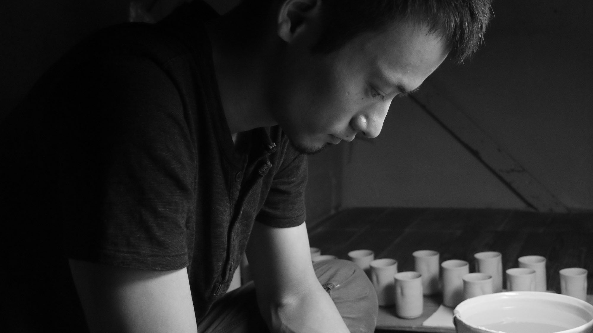自然豊かな京都府山科の工房で制作を行う村田匠也(むらた・たくや)さん。伝統の京焼を幼い頃から側で見ていた村田さんが解釈する茶の道具は、静かで瑞々しい。お茶の色を美しく見せる青白磁の肌の色や、使い手の所作を美しくする形にも注目していただきたいと思います。