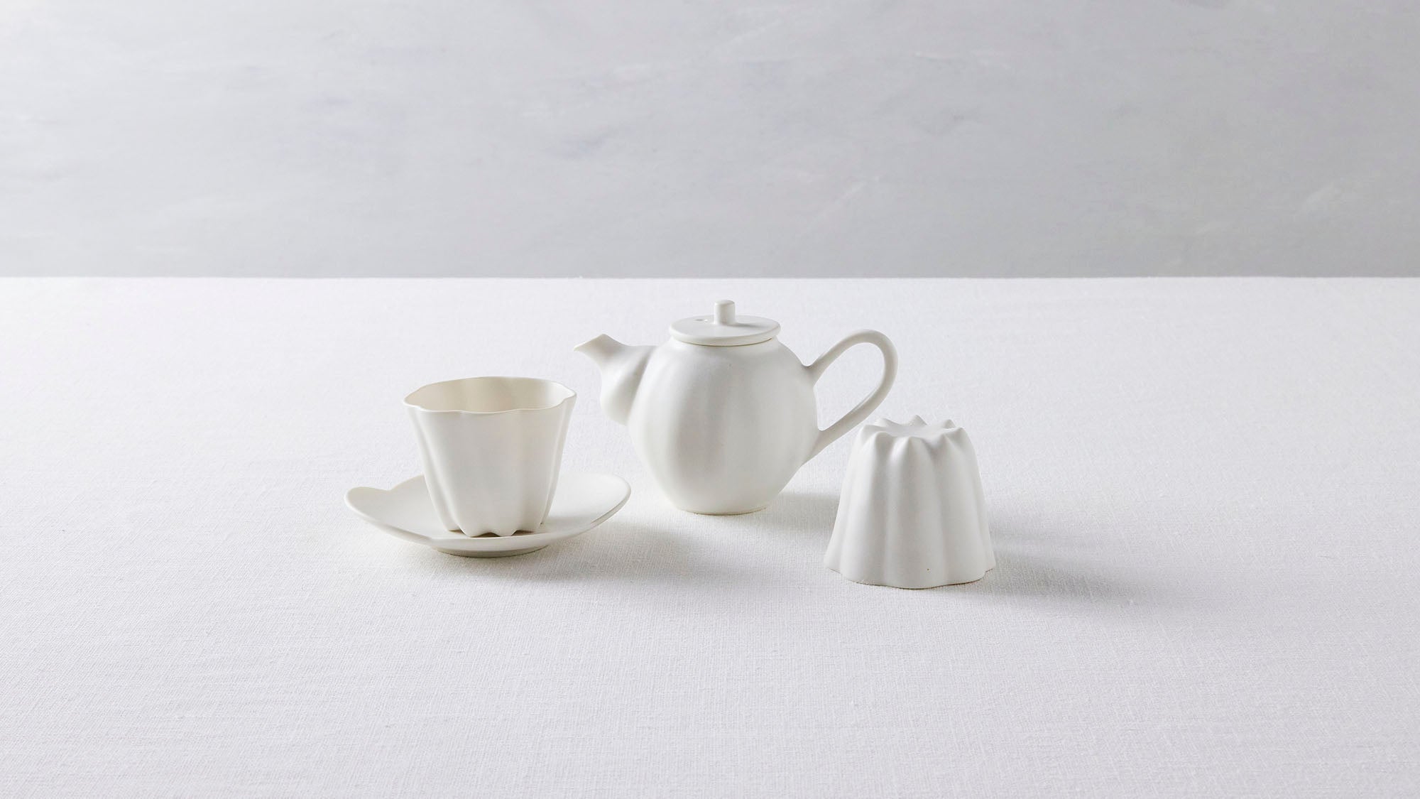 日本の丁寧なものづくりの姿勢を重んじながらも、洋のエッセンスを加えた作品で知られる藤村さんの器。フランス菓子のカヌレやお花をモチーフにしたという愛らしい茶器は、テーブルの上に華やかさを添えてくれます。