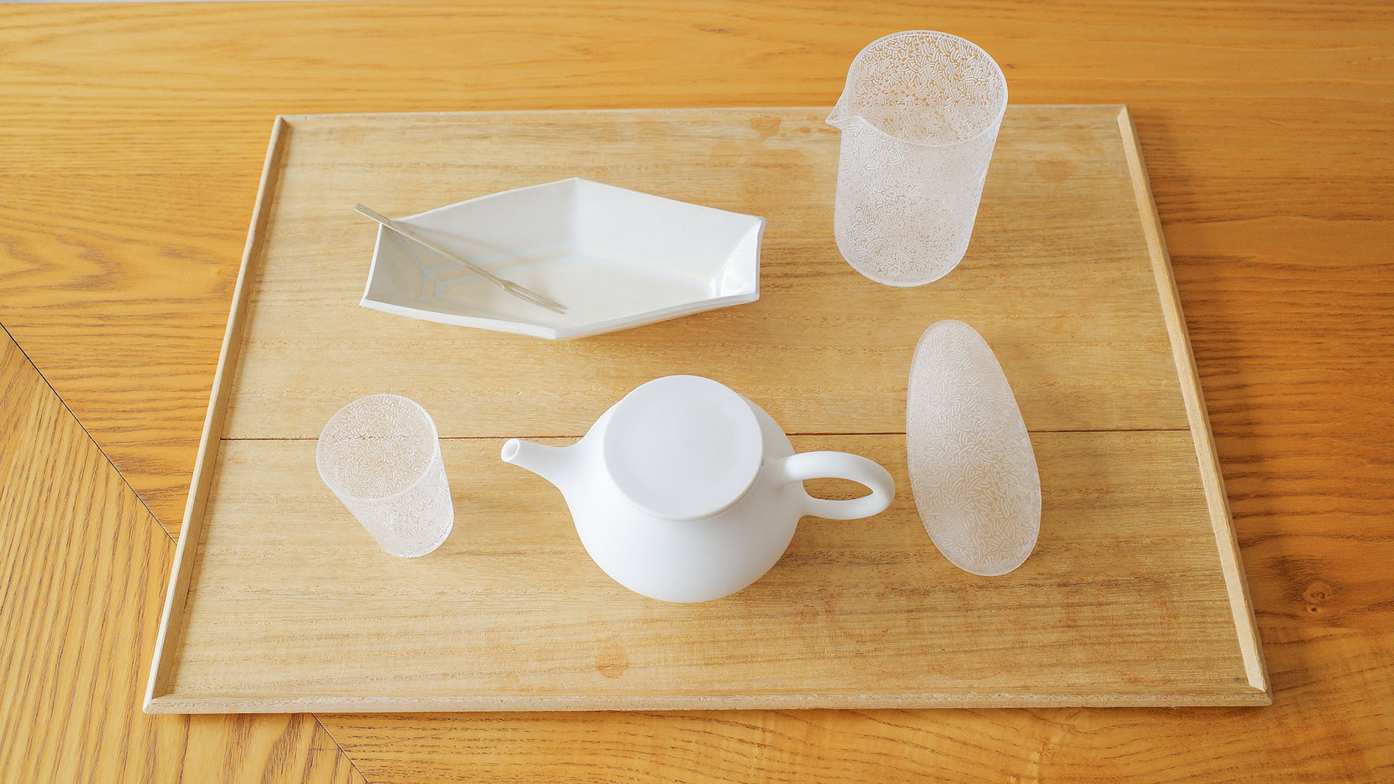 ガラスと、2種類の質感が異なる磁器を使ったスタイリングです。中原真希さんの急須は、こちらの「フラット」と「スパイラル」の二種類がありますが、三野直子さんと中里花子さんの作品が持つ、フェミニンさと少し緊張感のある雰囲気には「フラット」を。