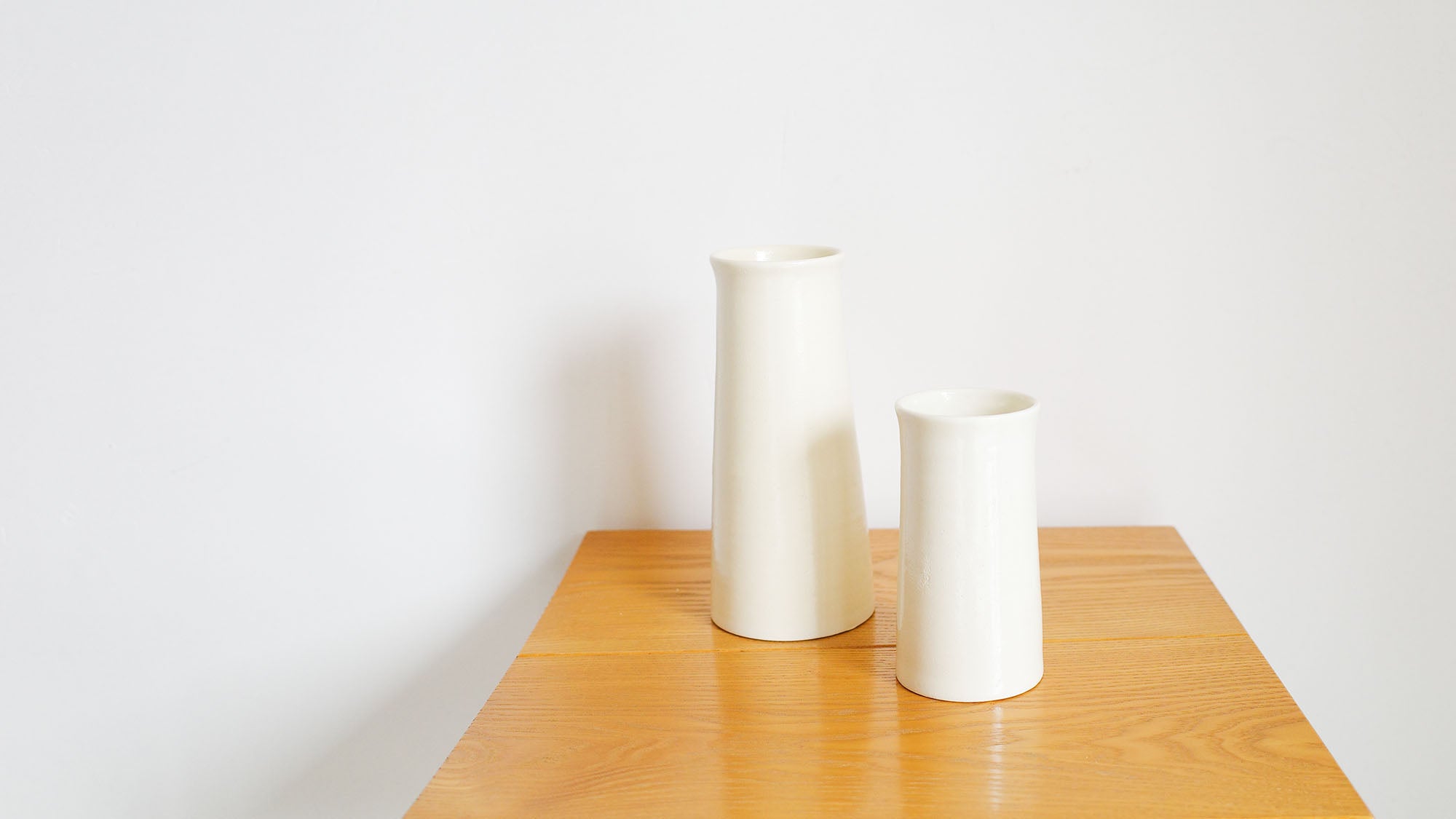 作山窯の「フラワーベース(細)」は、クリームがかった土に、優しい白の釉薬がかけられています。