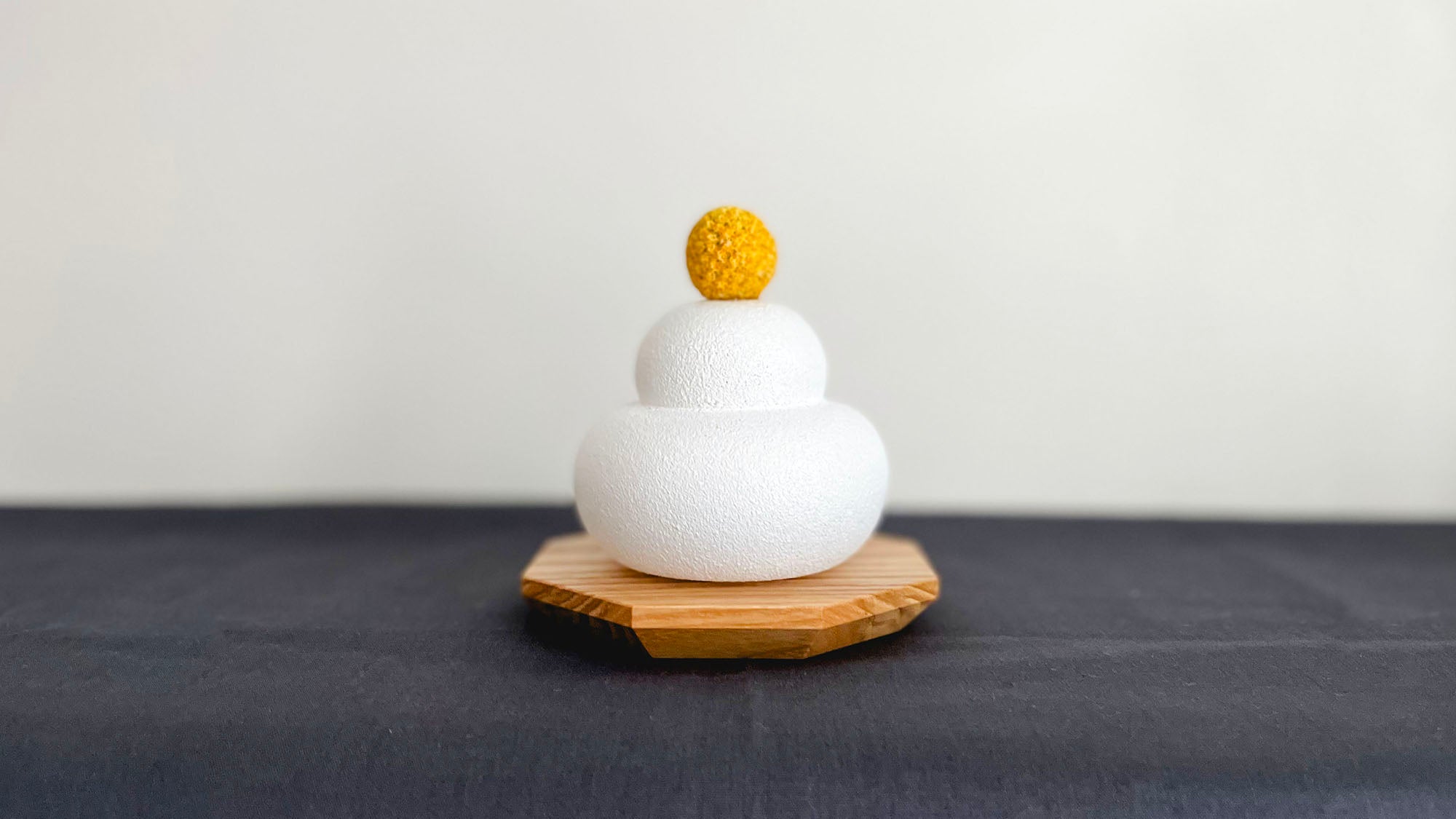 新登場の相馬佳織さん「ガラスの鏡もち」。玄関に、お部屋の飾り棚に…カジュアルにお正月の設を楽しむことができます。木の土台がついているので、置くだけで様になるのも嬉しい。
