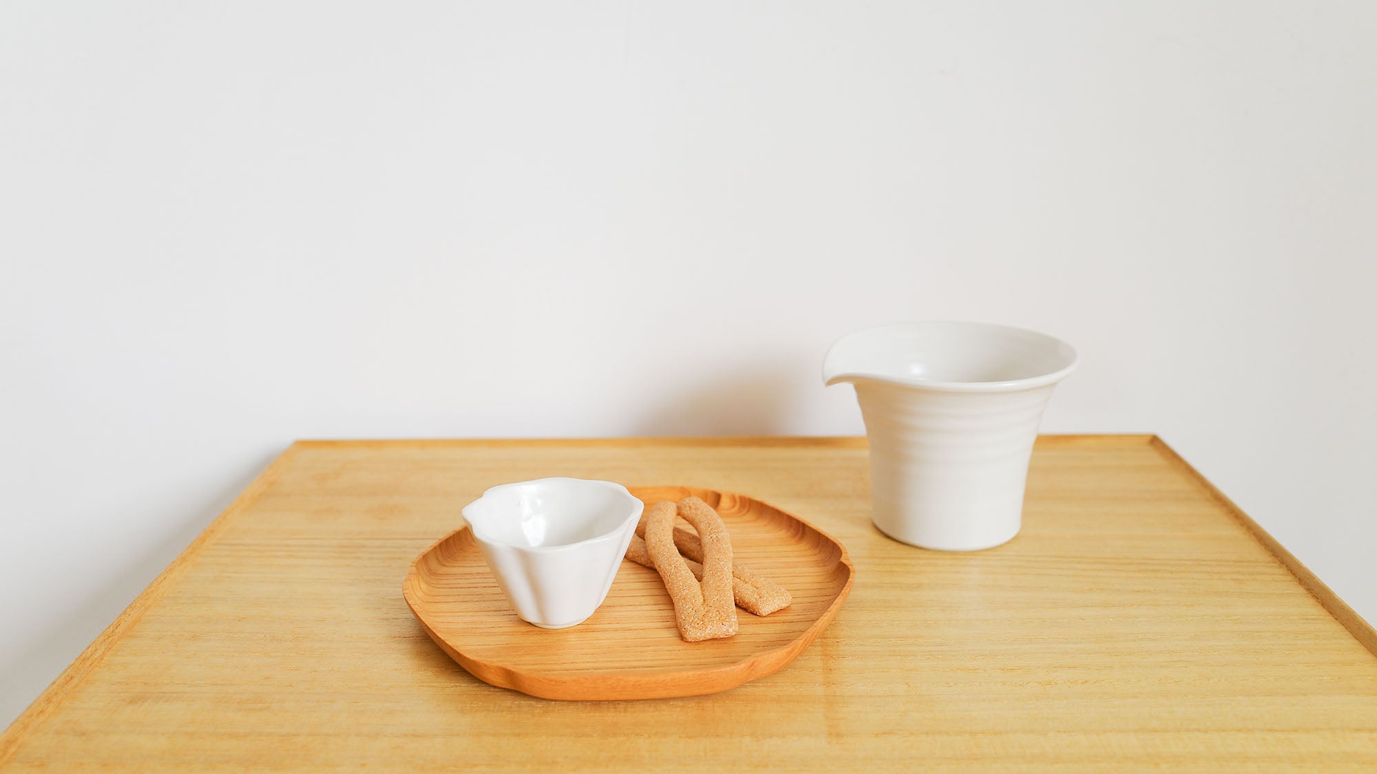 器ではよく見られる輪花と、日本の伝統文様である雪輪。寒い季節にぴったりです。なめらかな四十沢木材工芸の盆と、手の跡があえて残された中村豊実さんの対比を楽しんでください。