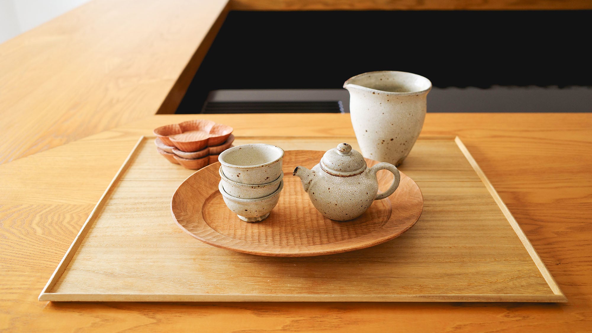 ヒビ粉引の風合いが心をほっとさせてくれる天野千香さんの後手急須(※2024年2月発売予定)や、茶杯、片口と合わせるなら、同じく優しい素材の木を。