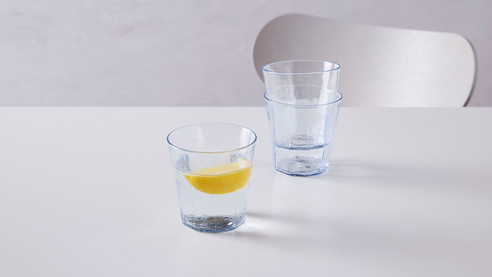 ハッとするほど純白のグラス。こんなにも美しいグラスはなかなか出会えません。よく見るとグラスの内側が真っ白く、外側にガラスの層があります。これは、飲み物の水色を鮮やかに映し出すということ。