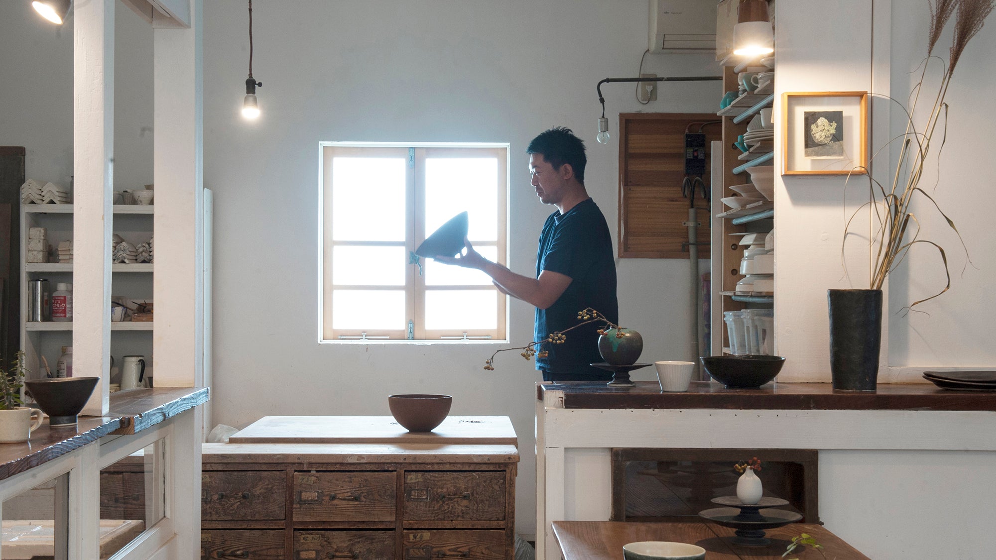 茨城県笠間市の窯元で7年間陶芸を学び、2011年からは埼玉県越谷市で作陶している飯高幸作(いいたか・ こうさく)さん。アトリエの隣には、器と古道具の販売もあるカフェ「kousha」があり、飯高さんの作品で食事をすることができます。