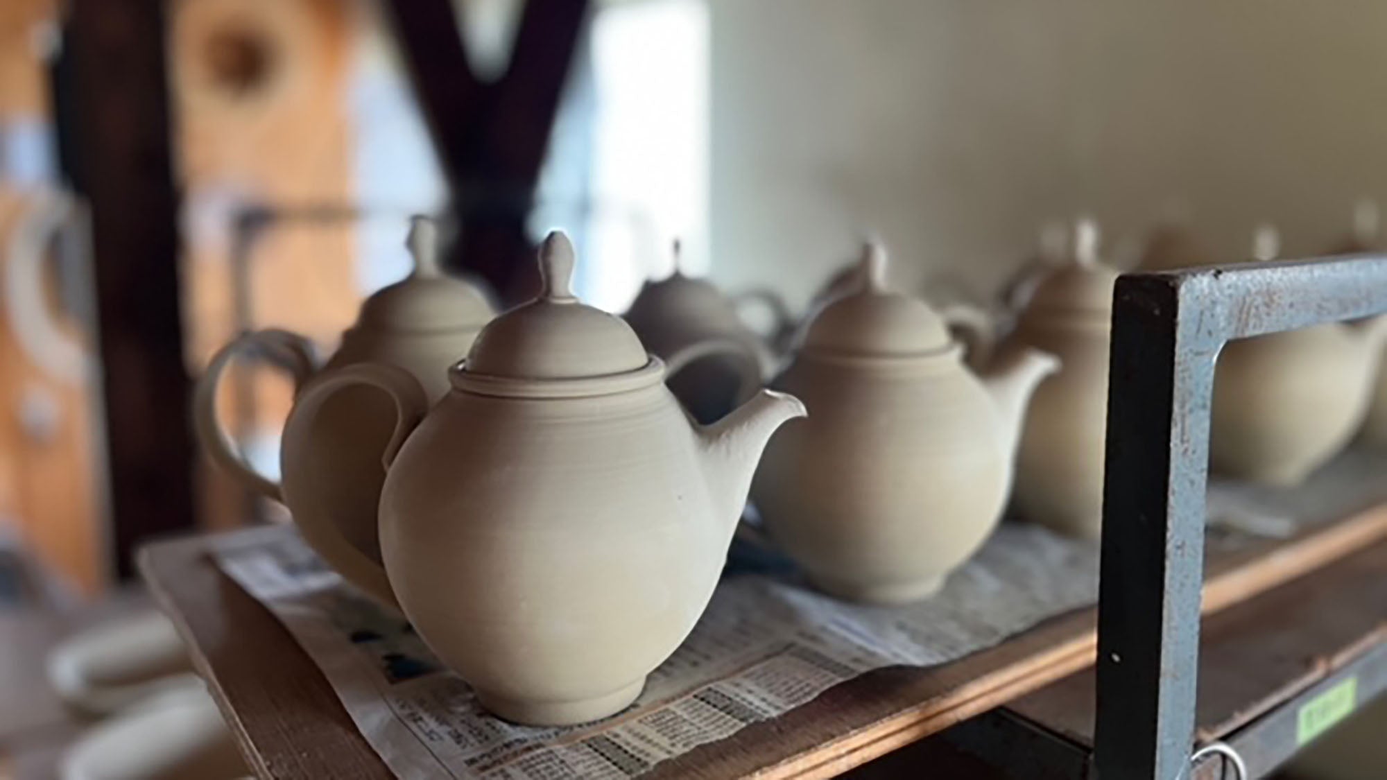 そんな環境で作陶する稲村さんの作品は、まるでずっと前から持っていたような感覚に陥りそうなほど「空間になじむ」ものばかり。今回は「ポット」、「茶杯」、「蕎麦猪口」、「板皿」をご紹介します。