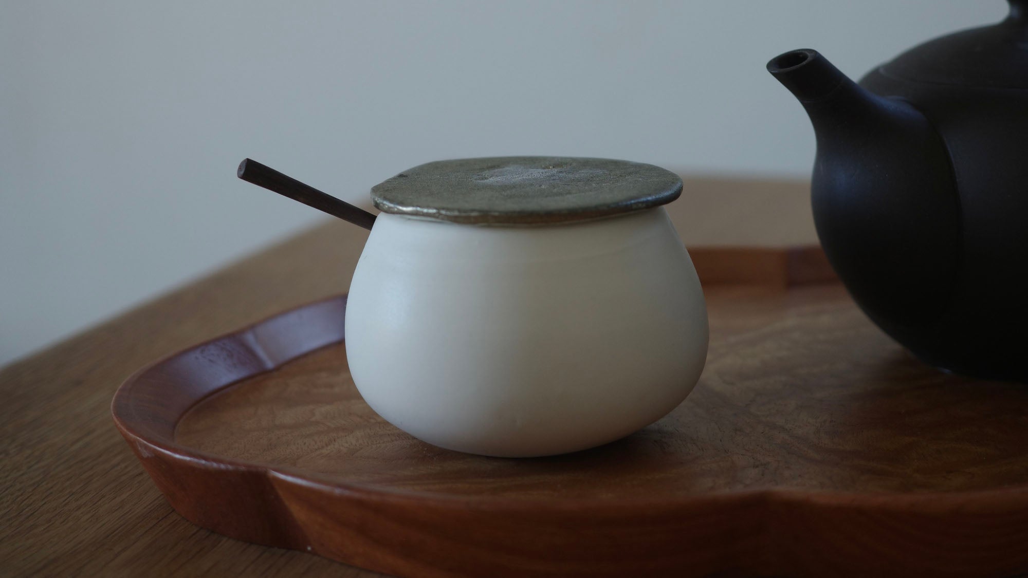 白磁マットのやわらかさと重みのある錫蓋が、異素材でありながらもかわいらしい佇まい。手に取ってみると、しのぎの面がふわっと手になじんで「一目惚れとはこのことか」と思うほどに惹かれたことを、今でも鮮明に覚えています。シュガーポットではありますが、わたしはお気に入りの茶葉を少し入れて使っています。
