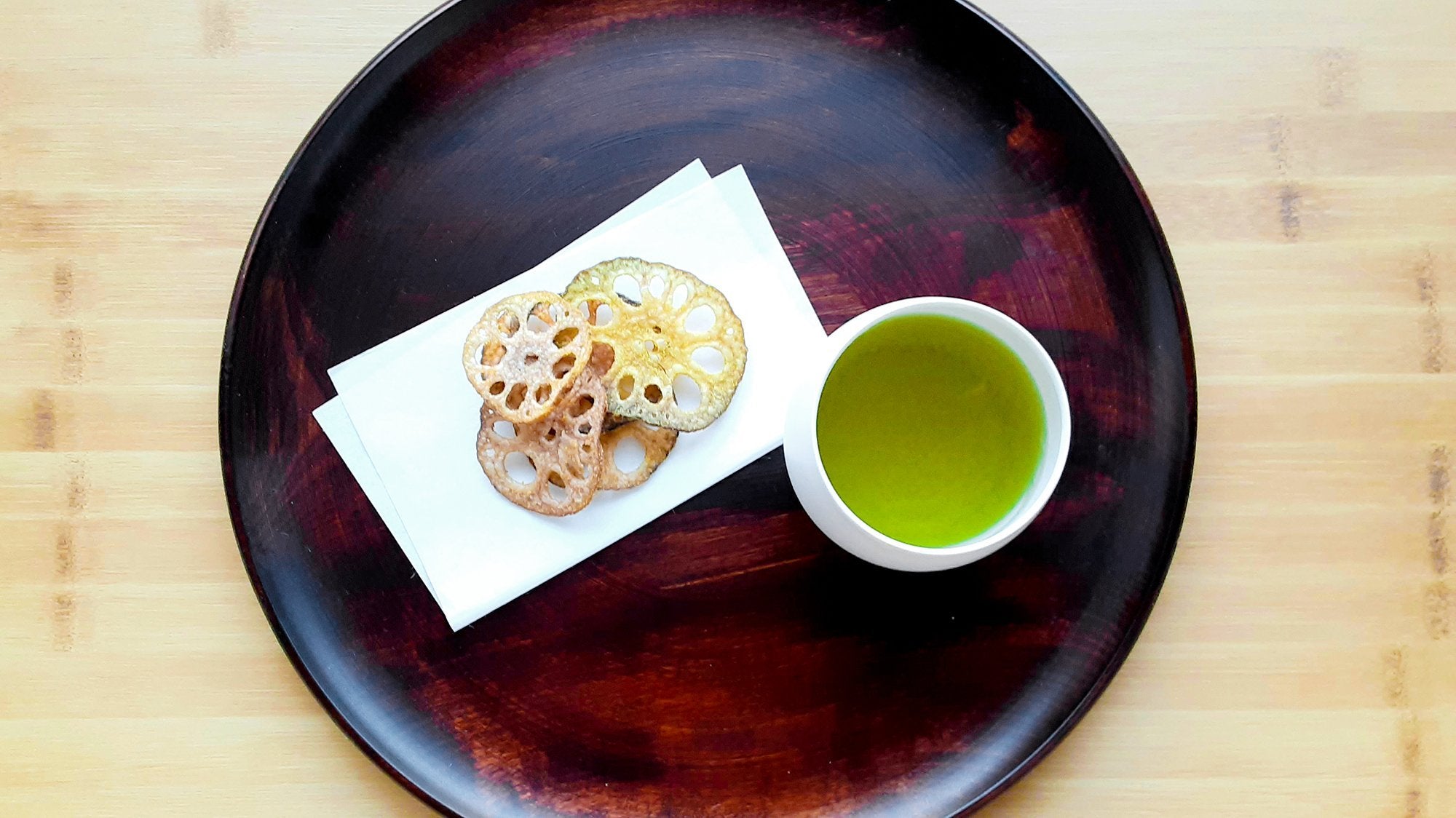 【お菓子とお茶】からし蓮根屋さんが作った「れんこんチップス」と「005 おくみどり」。ピリッと辛い煎茶のペアリング