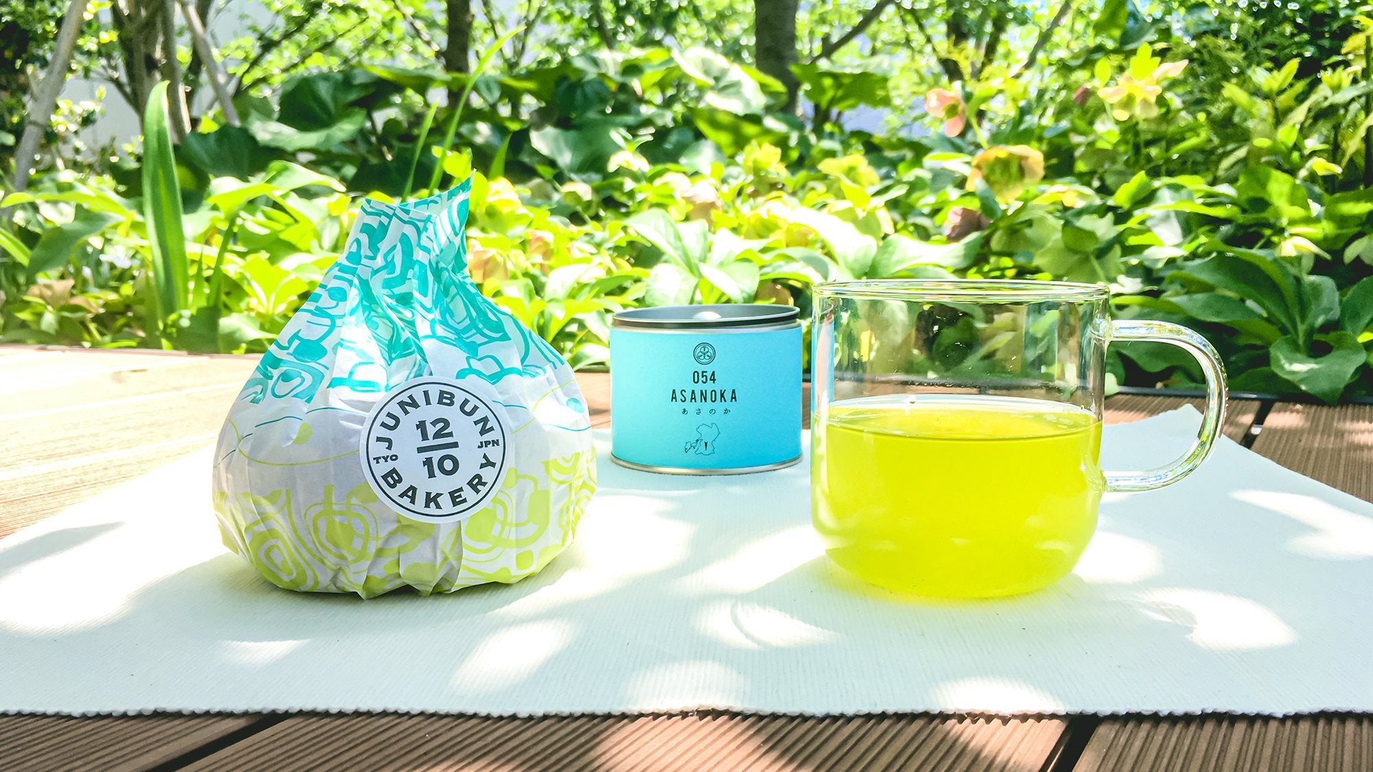 銀座SIXのループトップには、新緑の木々や花々が溢れ、爽やかな初夏の風が吹いています。今回、ペアリングに選んだのは熊本産の深蒸し茶「054 あさのか」。水色の缶が、涼しげに新緑のティータイムを彩ります。お茶を淹れるゆったりとした時間が都会の喧騒を忘れさせてくれるのです。
