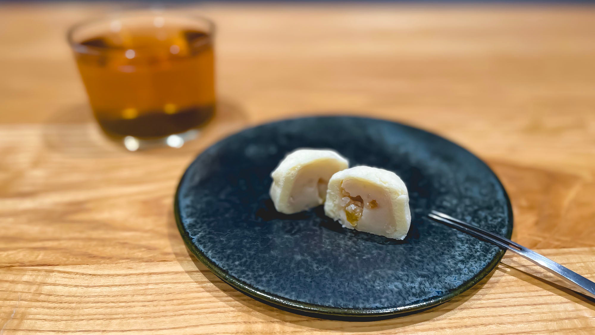 実際合わせてみると、完璧な調和を感じさせる組み合わせ。ほうじ茶のカカオ豆を思わせる焙煎の香りと、柚子の清々しく爽やかな香りがよく合います。柚子餡に染みこむ、ほうじ茶の柔らかな苦味が堪りません。