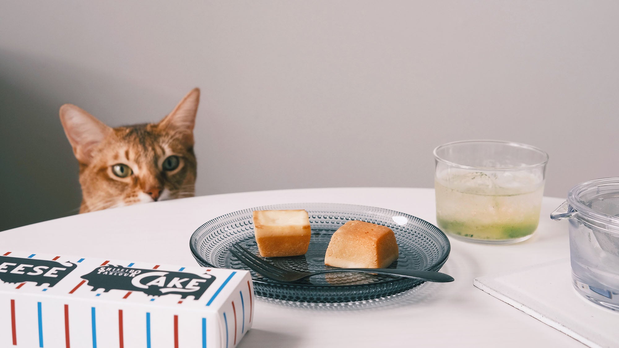 チーズが好きなうちの猫。チーズケーキやお茶の周りをウロウロしていました。暑い夏に冷たいお菓子とお茶。お腹も気分も涼やかになりますね。