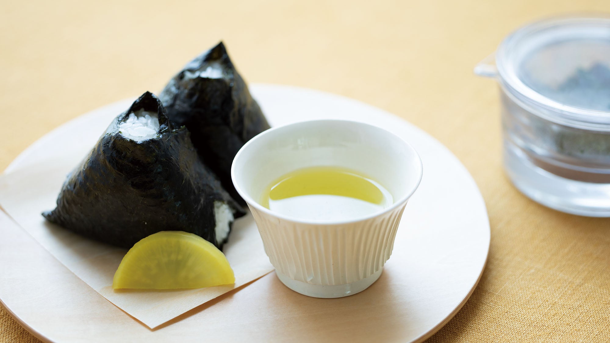 おむすびを食べ終えたら二煎目を。カップにお湯を注ぎ、温めたらお湯を捨てます。急須に85℃のお湯80mlを注ぎ、15秒抽出したらカップに注いでいただきましょう。