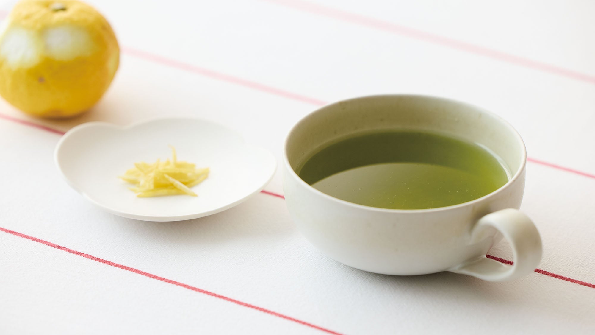 器をお湯で温めておきます(分量外)。急須に入れた茶葉の上に柚子の皮をのせ、80℃のお湯100mlを注ぎ、1分蒸らしてから器に注ぎます。