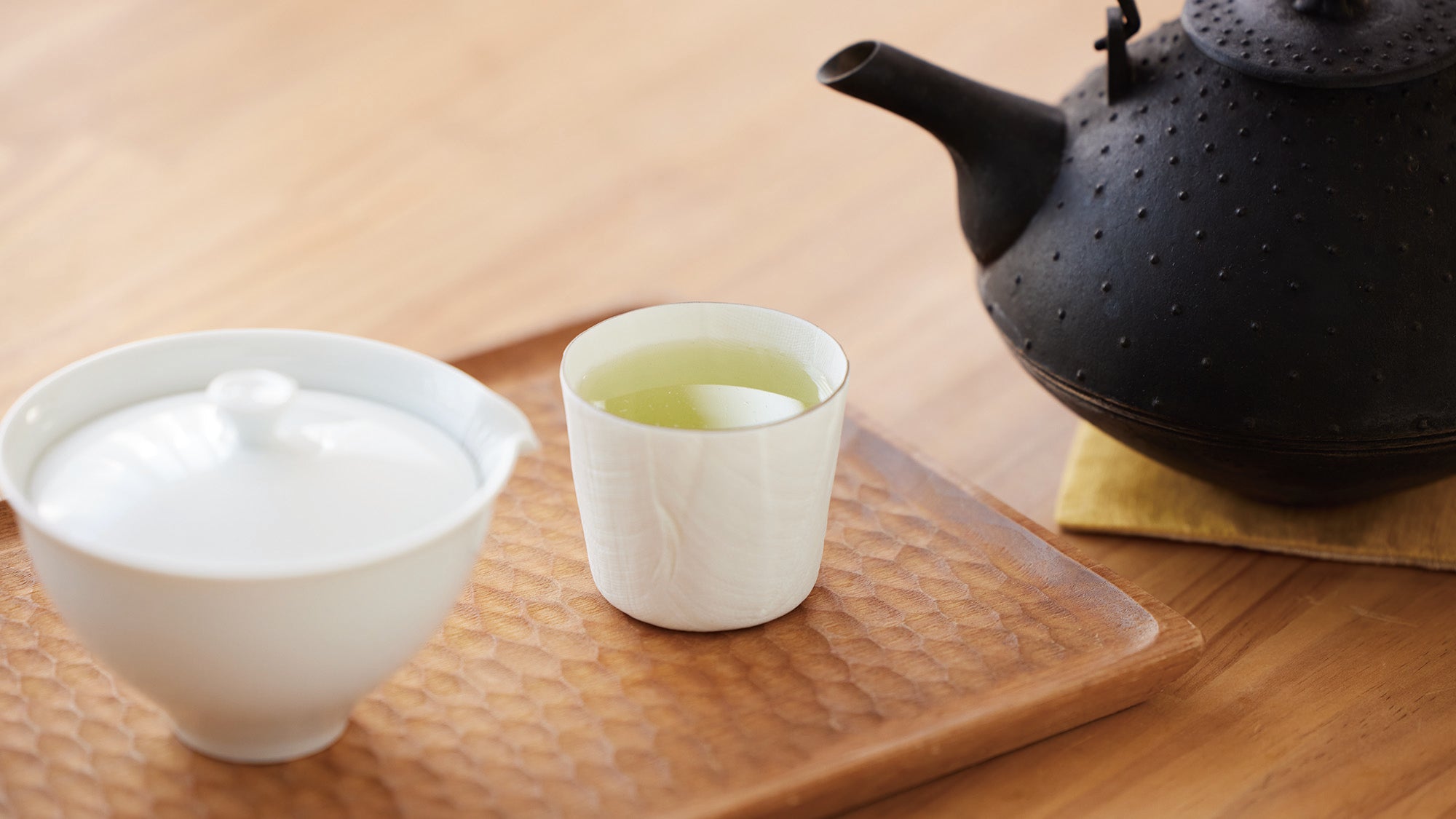 器をお湯(分量外)で温めておきます。茶葉を入れた急須に80℃のお湯100mlを注ぎ、1分10秒置いてから器に注ぎます。