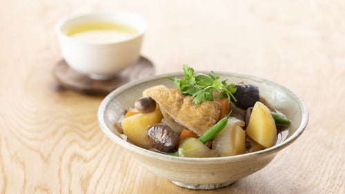 椎茸とお茶のうま味相乗効果で味わう秋の味覚。「肉なし肉じゃが」と「022かなやみどり」レシピ