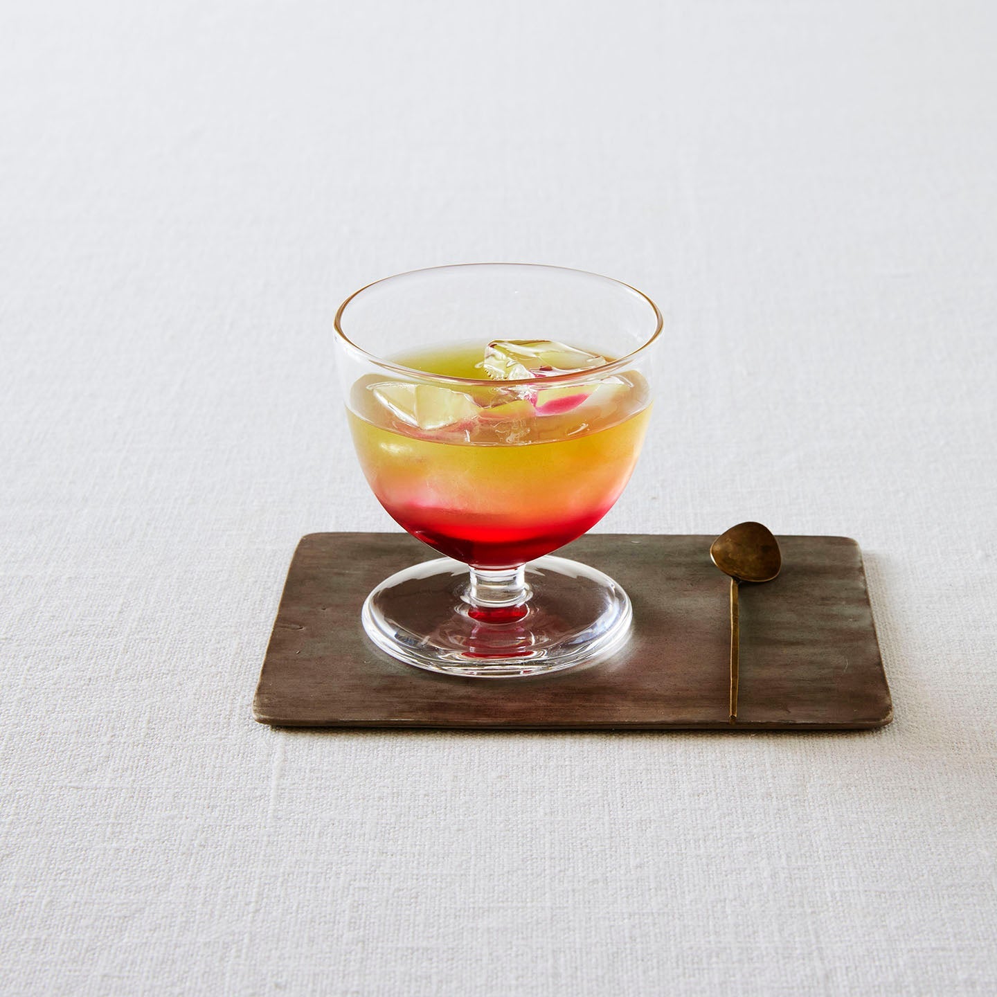 グレナデンシロップを入れてから、オレンジジュースをゆっくり注げばグラデーションがキレイなモクテルの出来上がり。ここにテキーラを入れたらテキーラサンライズに。明度の高いグラスに夕日の様なグラデーションが美しく映えます。曇りの日にはグラスの中に夕焼けを見るのも良いですね。