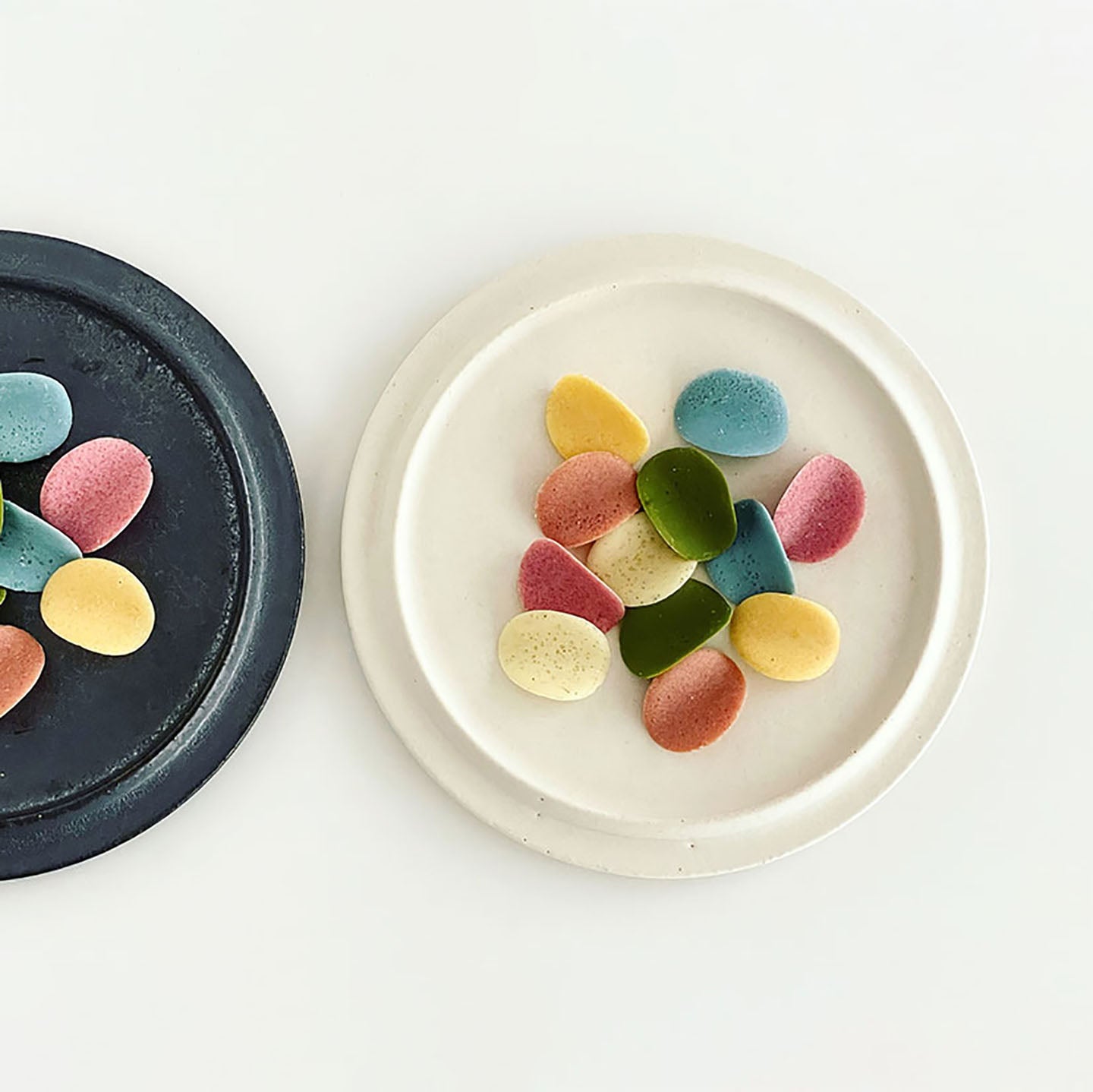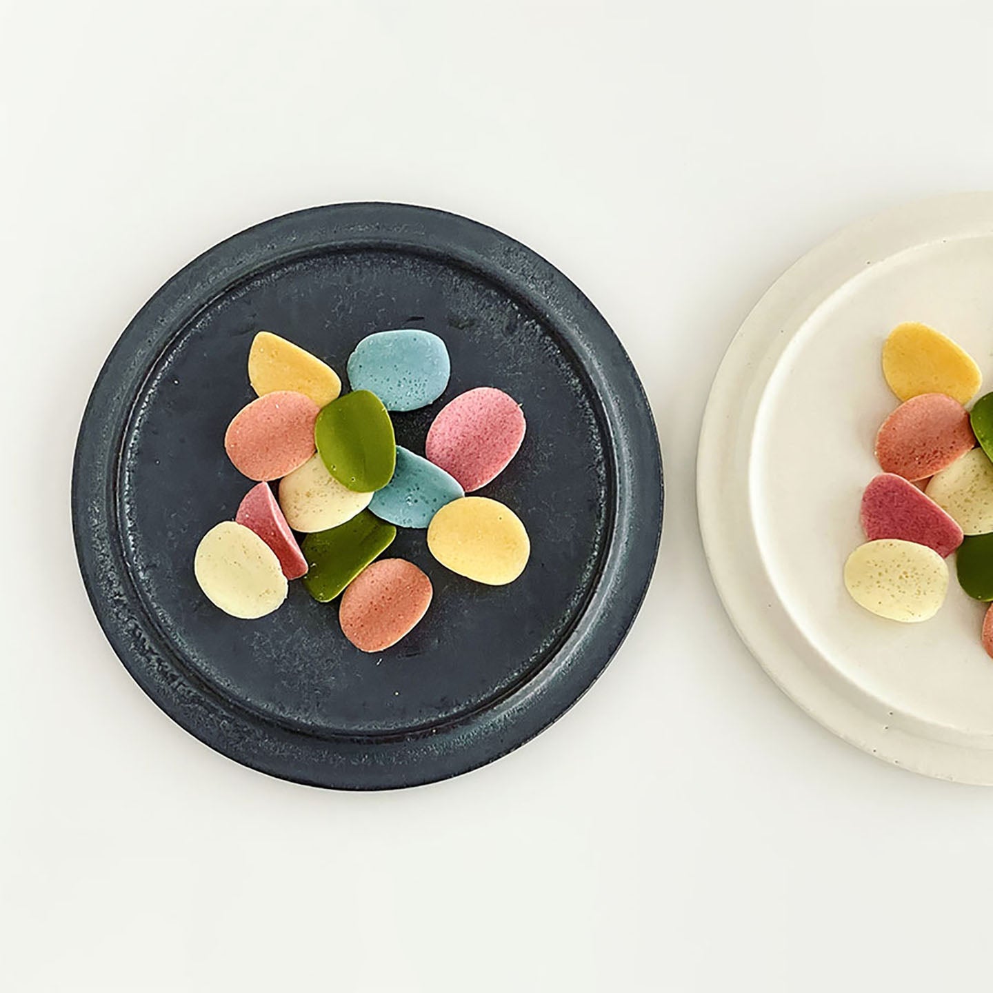 菓子研究家の福田里香さんは2色のプレートに、カラフルなチョコレートを盛り付けてより魅力的に。