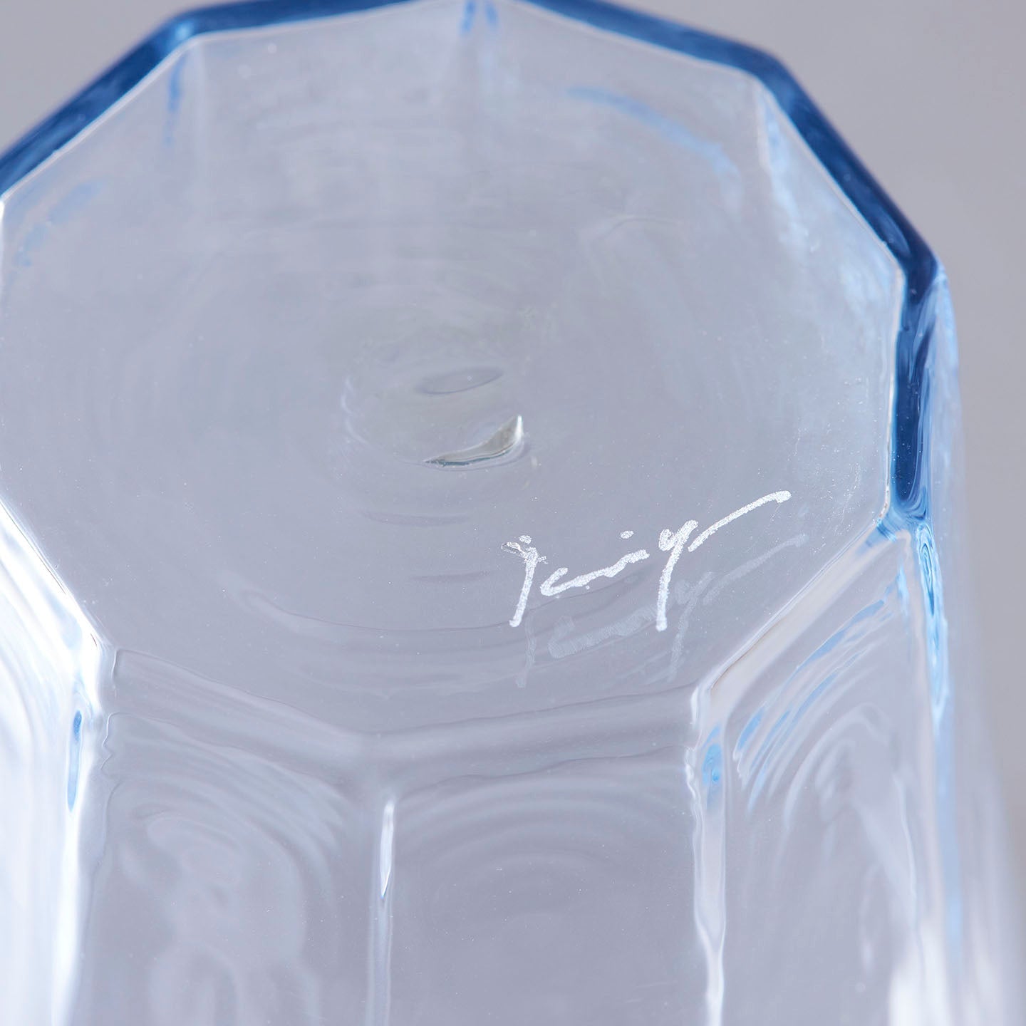 そして、サインやポンテ(吹き竿から別の竿に受け渡す工程で、接着剤代わりに少量のガラスを使って竿を器の底にくっつけた後、外した時にできる跡のこと)も見えます。手仕事の跡にも触れられるのが嬉しい。