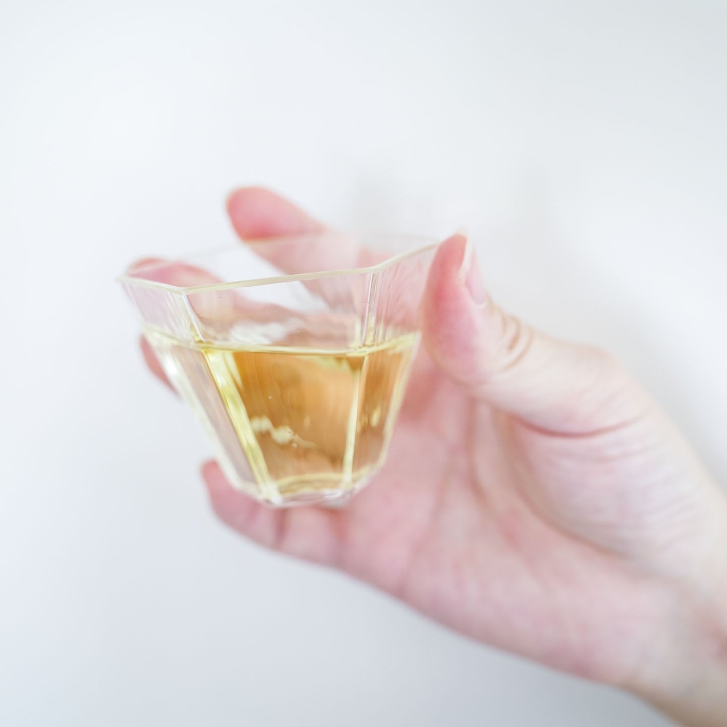 お茶を注げば、クリアなガラスの中でお茶がゆらゆらとゆらぎ、眺めているだけでうっとりした気持ちに。光を通すと、テーブルの上にキラキラと波打つ光の乱反射が美しく、小さな器が何倍にも輝いて見えます。