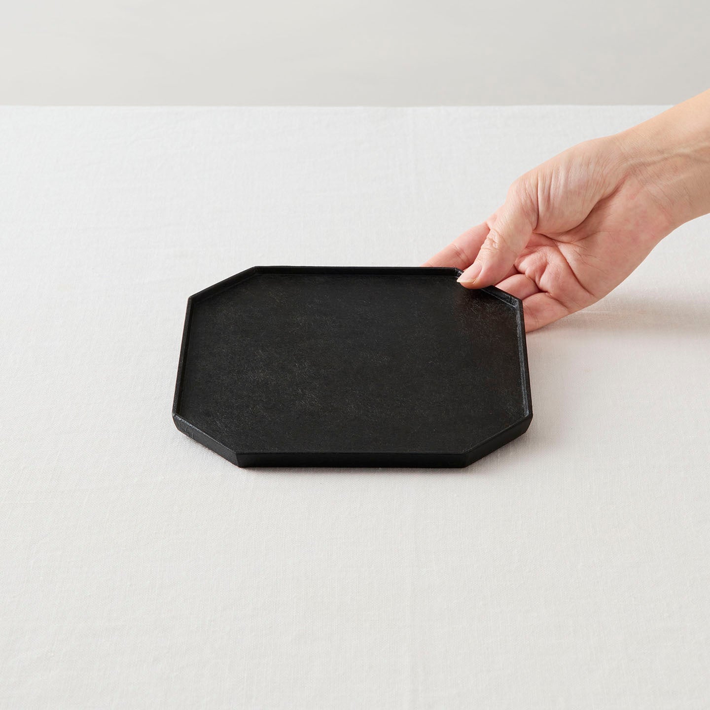 茶道具とのコーディネートが楽しめる木製の八角形の「ティートレー」。厚さ1cmほどの薄さで、ふわりと手に取れるほどの軽さを持ち合わせています。スタイリッシュでありながら、日常使いにもぴったりな使い勝手の良さが魅力です。