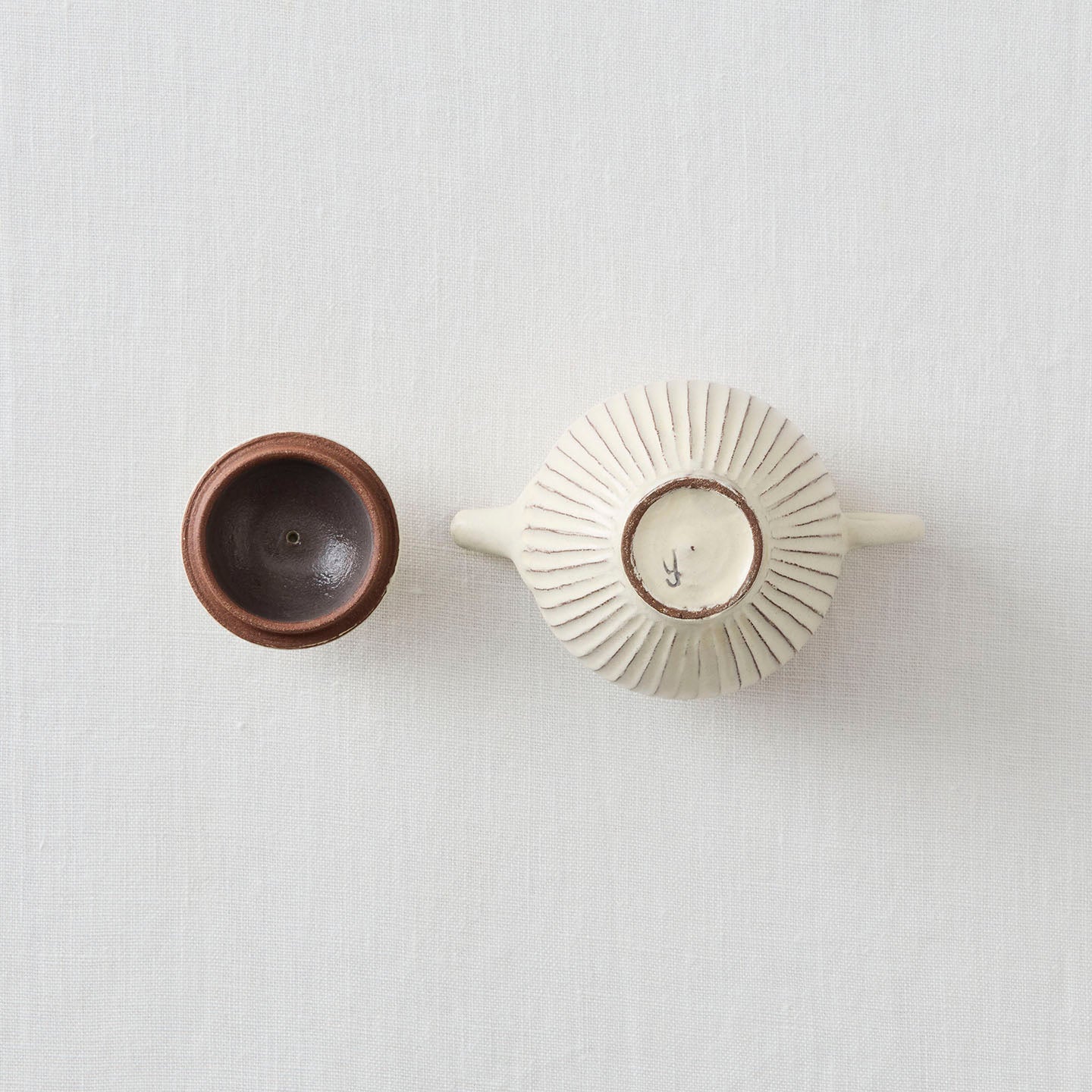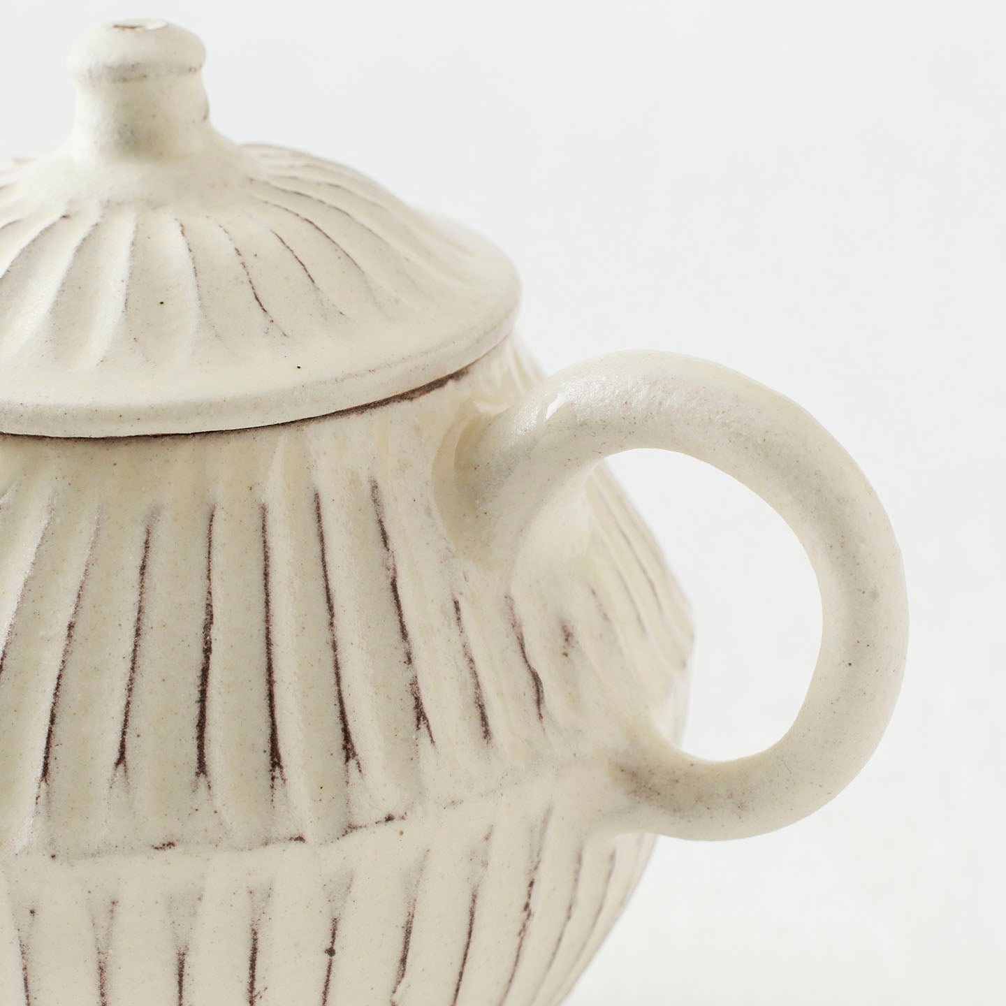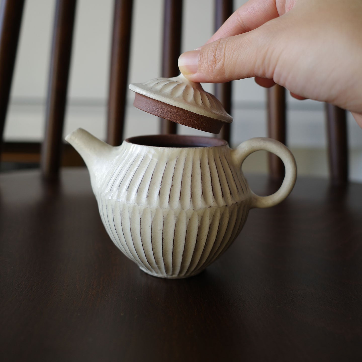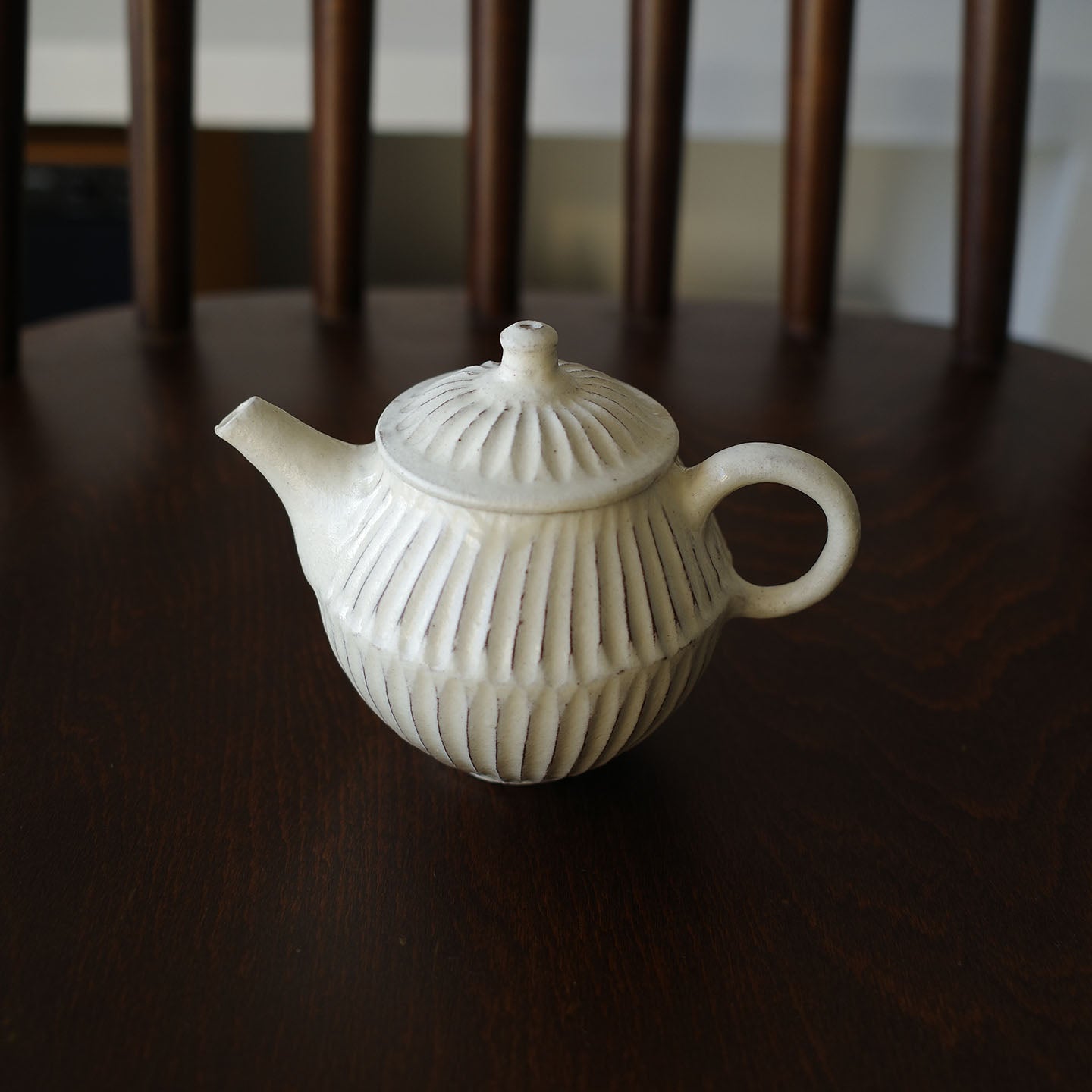 ころんと丸みのあるフォルムに、細かい鎬がリズミカルに刻まれた「縞茶壺」。小さな器ですが置くだけで空気が柔らかくなるような、静かな存在感があります。白釉はややクリームがかったやさしい色味で、黒い茶海や木のトレイと合わせると、より凛とした表情に。