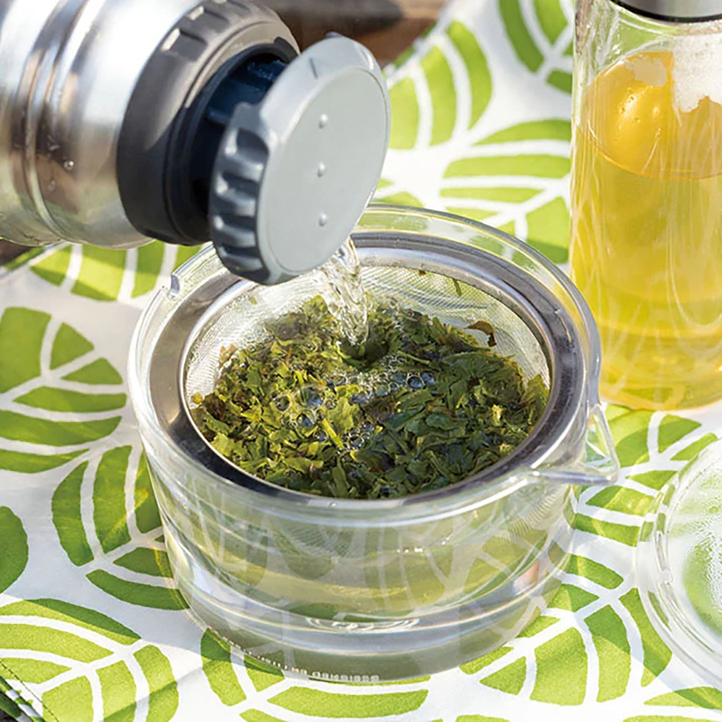 茶葉の手揉み工程で桜の葉を加えて作る『さくらの煎茶』は、毎年定番のフレーバー。甘く爽やかな香りが立ち、ひと口飲むと優しい旨みが広がります。時間が経つとほのかに渋みが出ますが、キレがよくすっきりと感じられるので、少し長めの散歩のお供にもおすすめです。
