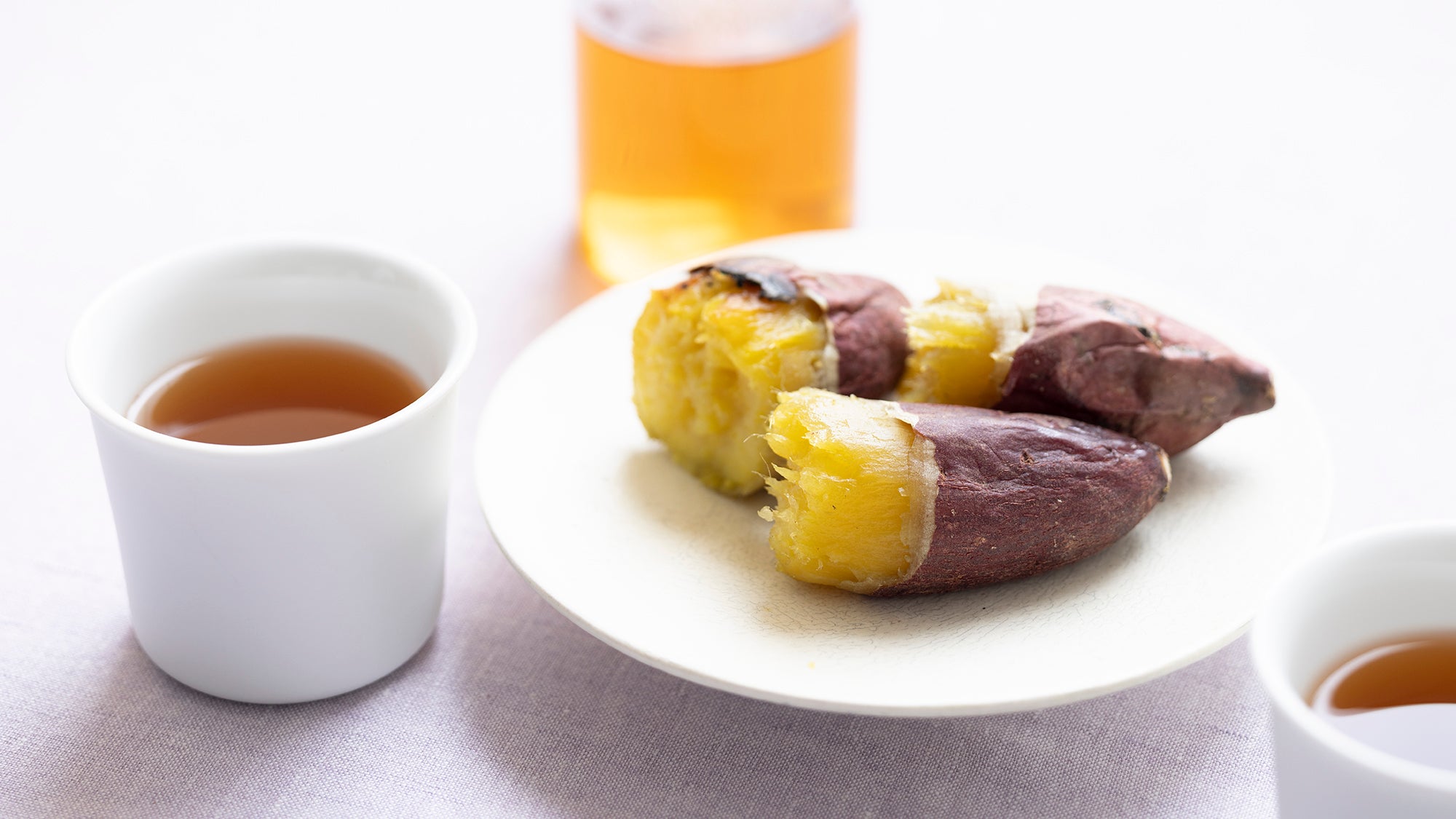 今回お届けする「やぶきた」シングルオリジンの棒ほうじ茶に合わせたのは、ねっとり系の品種・紅はるかの石焼き芋。じっくりと火を入れて甘味を引き出した紅はるかの皮の香ばしさと、ほうじ茶の焙煎香がマッチしつつ、口の中をさっぱりと洗い流して、また次のひと口を美味しくしてくれます。おやつにも、朝ごはんにもおすすめ。