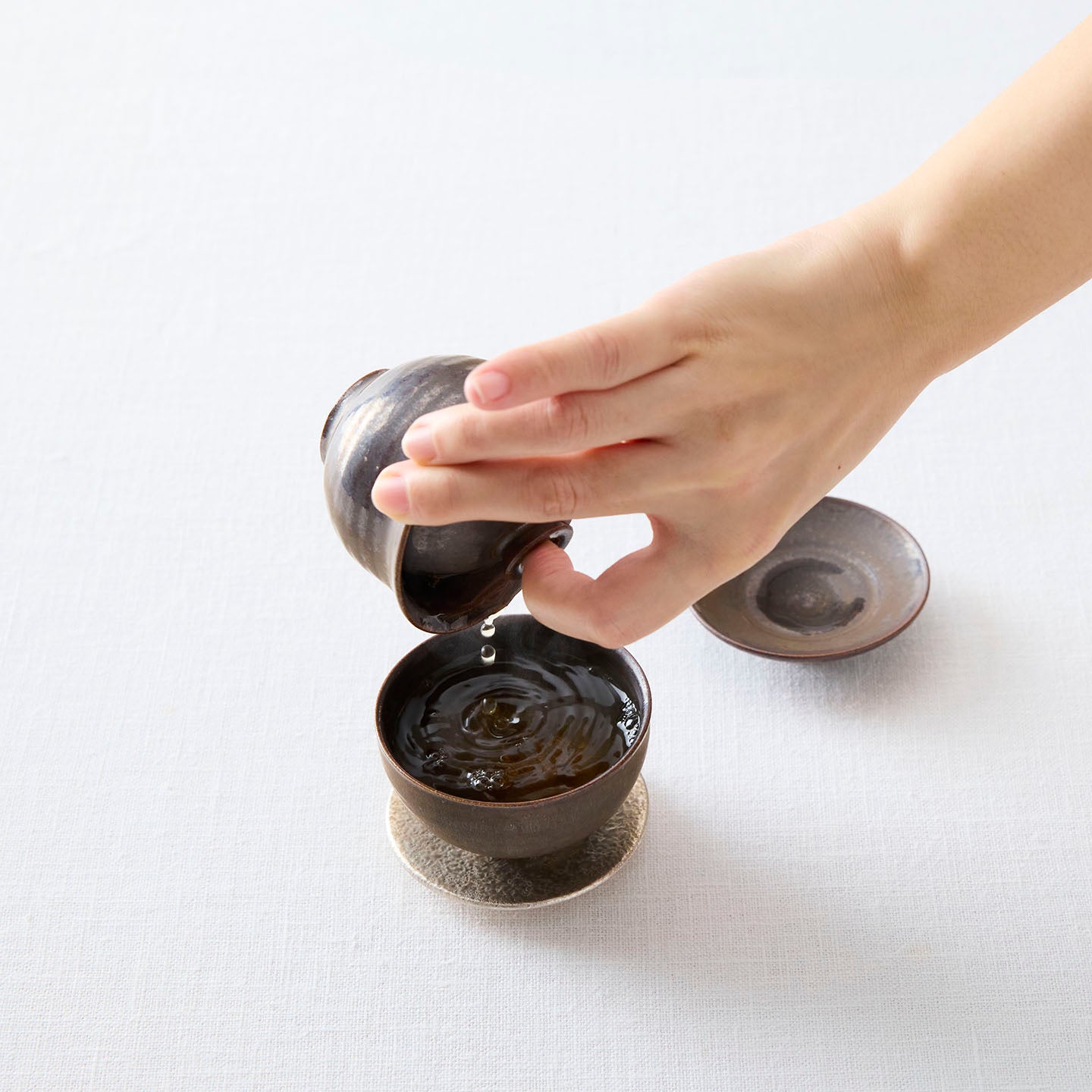 錆釉の深みある色合いが、お茶の水色や茶葉の景色を引き立て、落ち着きのある空間を演出します。