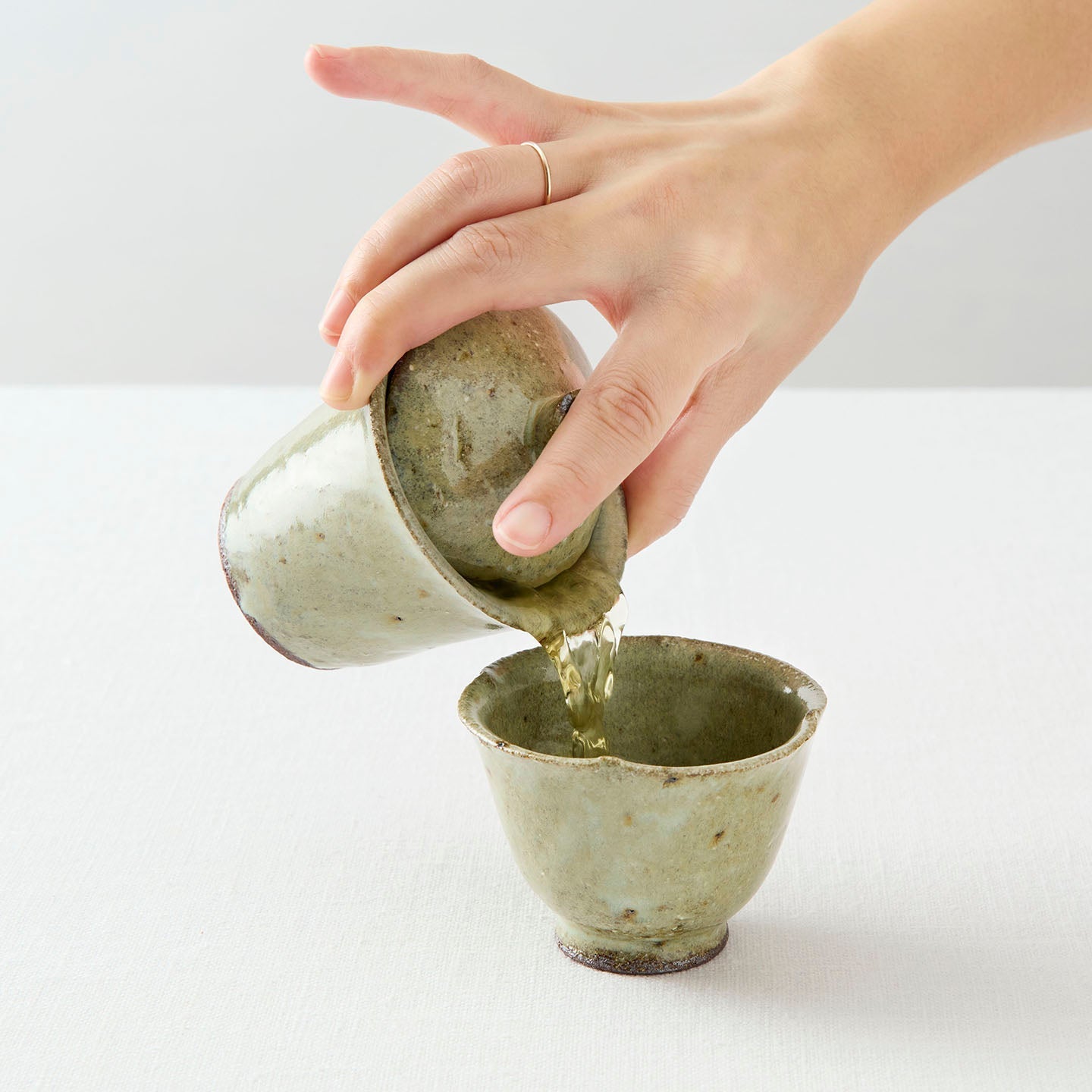 落ち着いた灰白の釉薬が、お茶の水色を美しく引き立ててくれる器たちです。