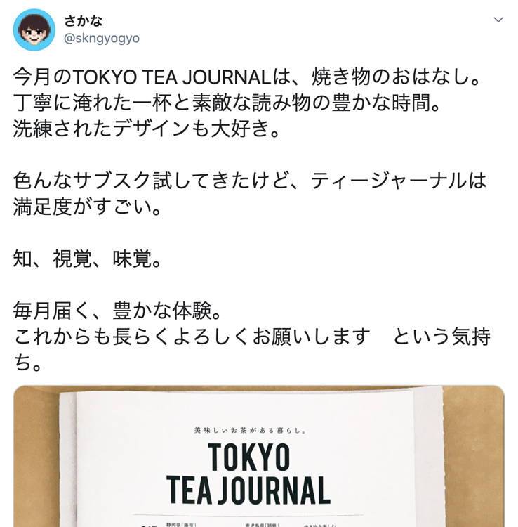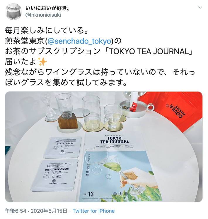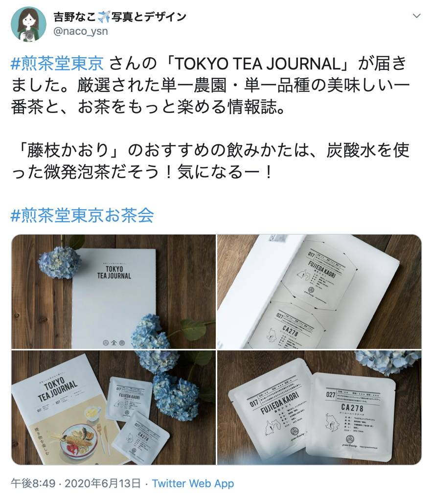 あくまで「煎茶堂東京」のイメージをはみ出 さずに、洗練されていて、でも読んでほっと するようなものを意識しています。お届け後 SNSでTTJの表紙とお茶で写真を撮ってあげ てくれている方が多くて、そうした生活の一 部になっているのがとても嬉しいです。