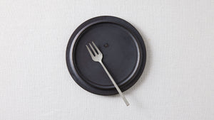 墨が染み込んだ黒い貫入が表情をつくる。ハラコウイチさんの陶器の器