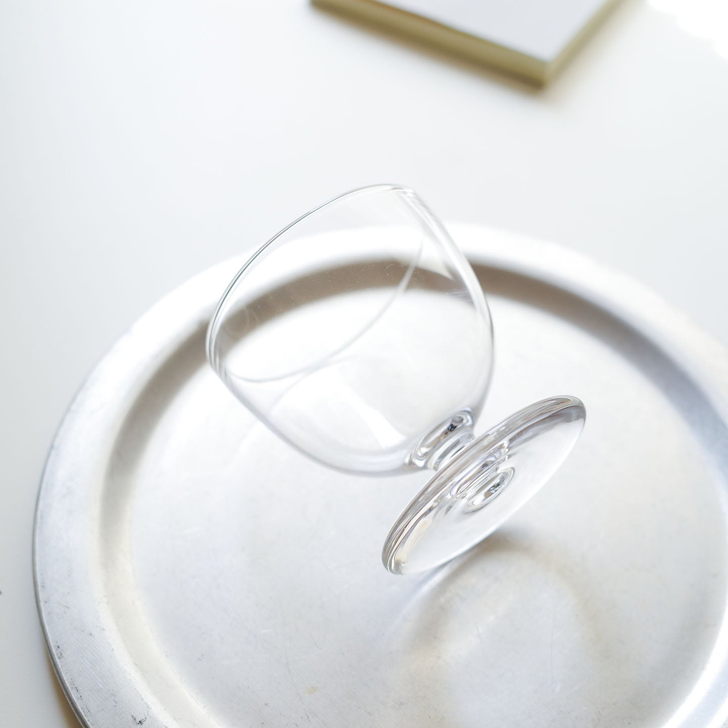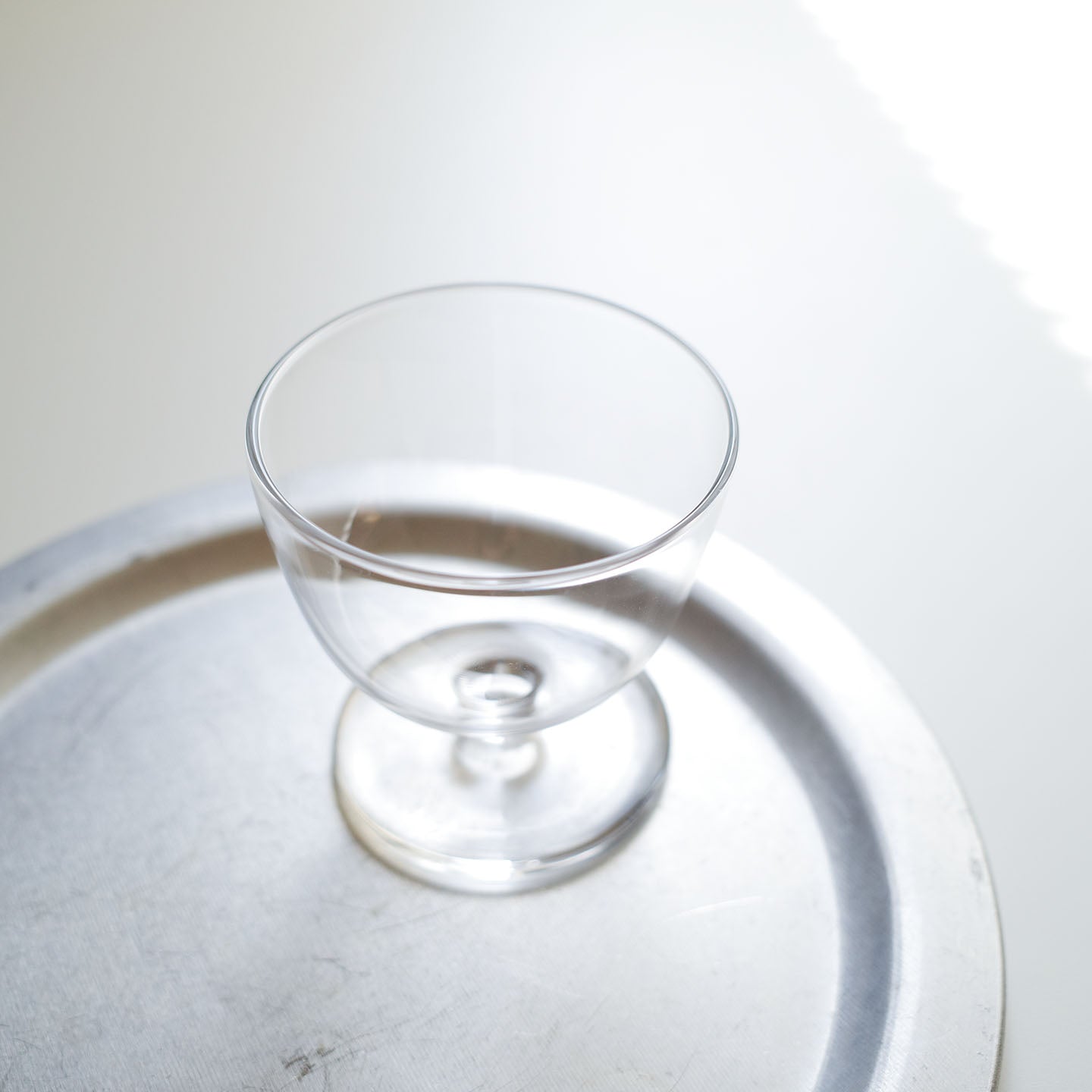 髙橋さんの「脚付きグラス」はステムがとても短く、プレート部分にぽってりとした厚みがあり、おさなげで可愛い印象があります。自然光にかざすと見える宙吹きならではのゆらぎとシルエットのかわいらしさが相まって、うんと愛でたくなります。