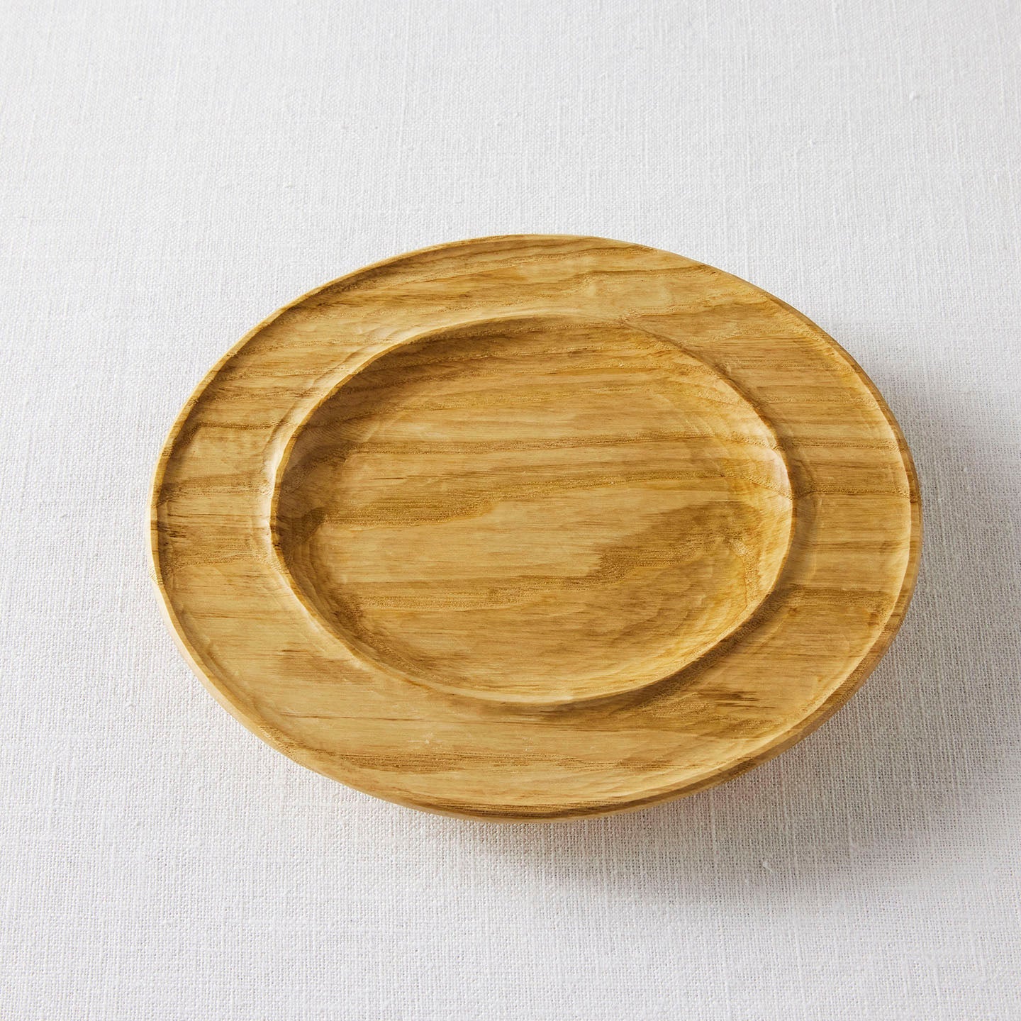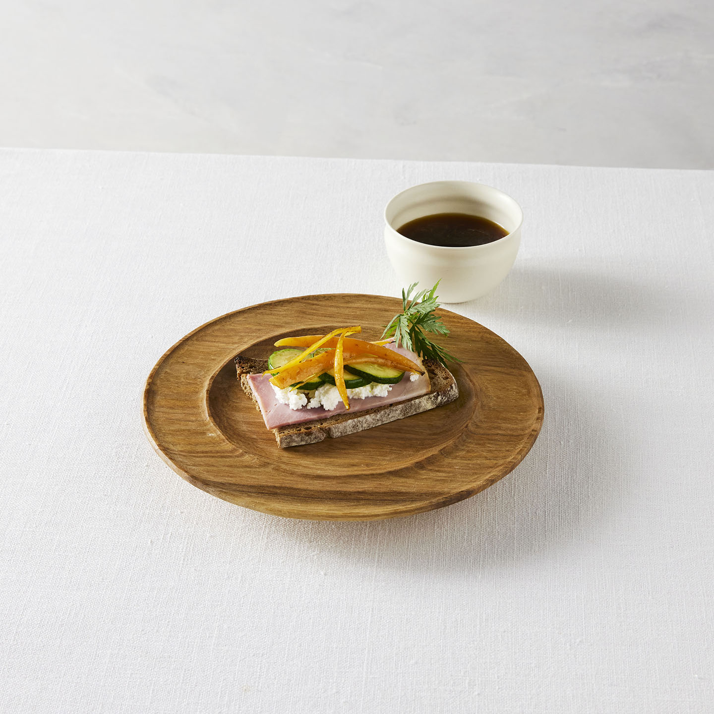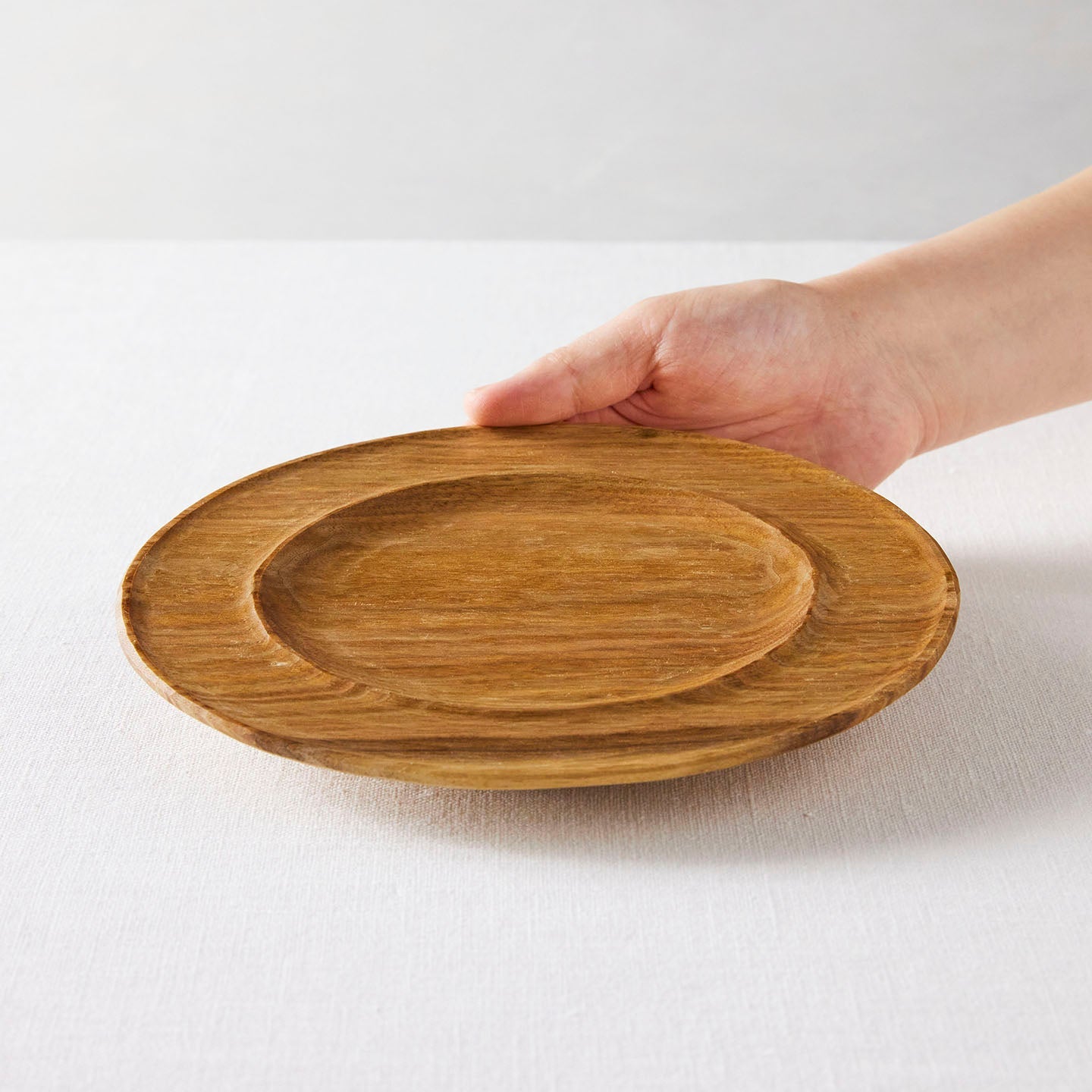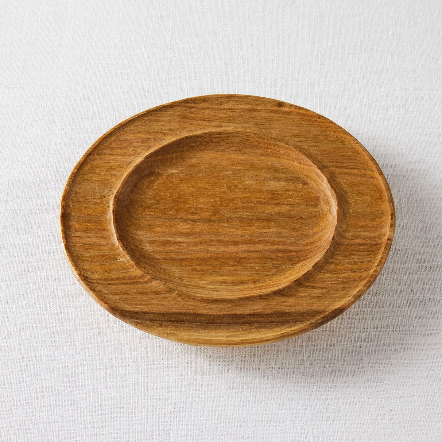 「八角皿、楕円皿ともに直接料理を乗せるだけでなく、ほかの器の台として使用することをイメージして作りました。とくにガラスの器は非常に相性がよく、パートナーが営む食堂ではガラスの器に入れた冷たいスープやサラダなどを木皿に盛り付けて提供しています」(山田さん)