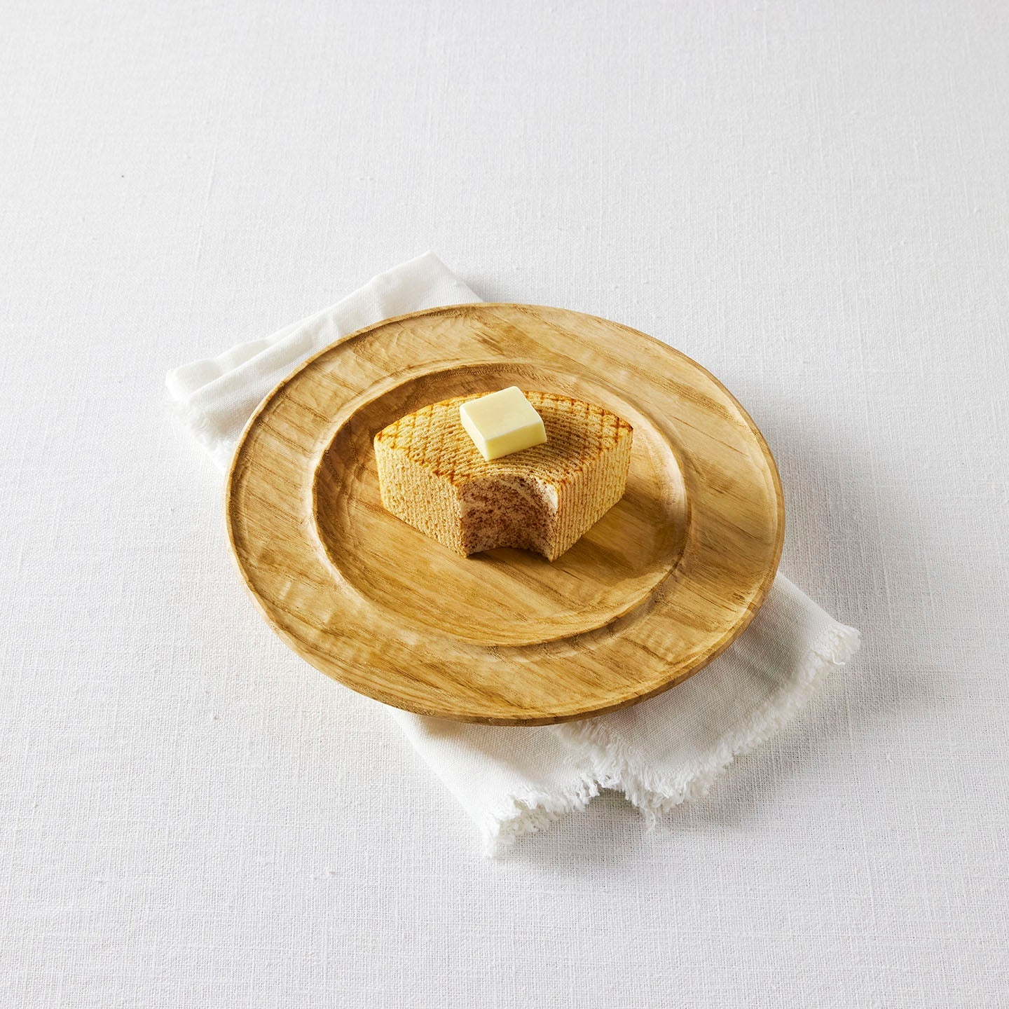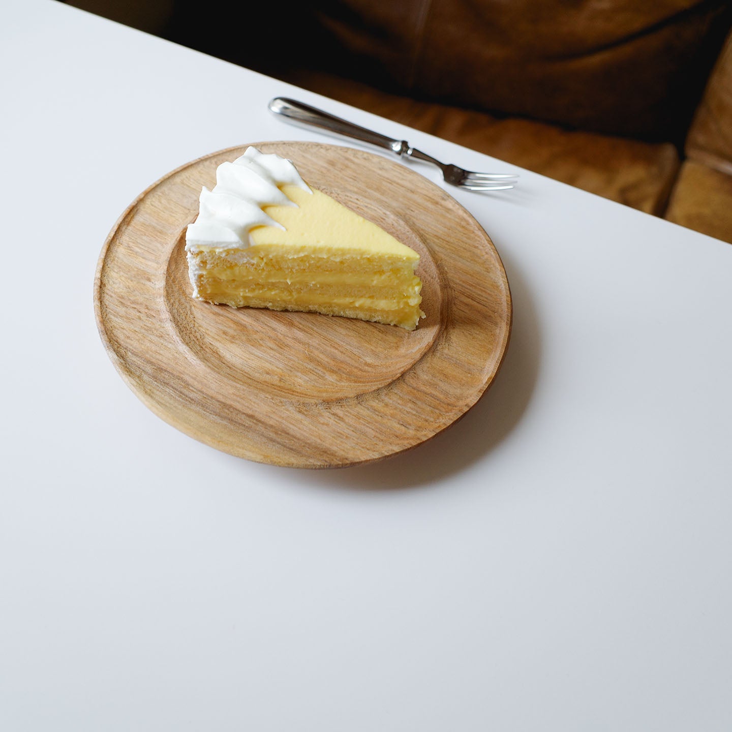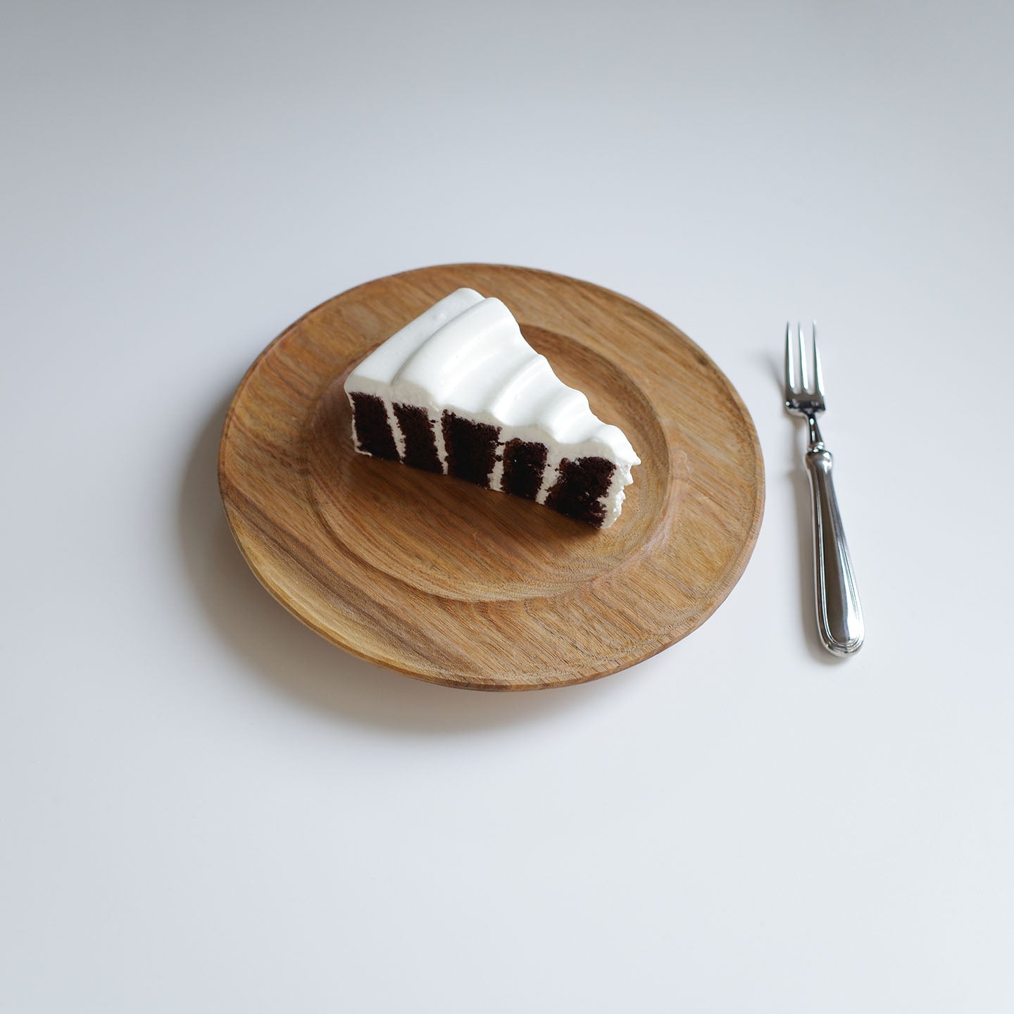 柔らかい印象のケーキと木の素材はよく合います。シルバーの使い込まれたカトラリーと合わせても素敵です。