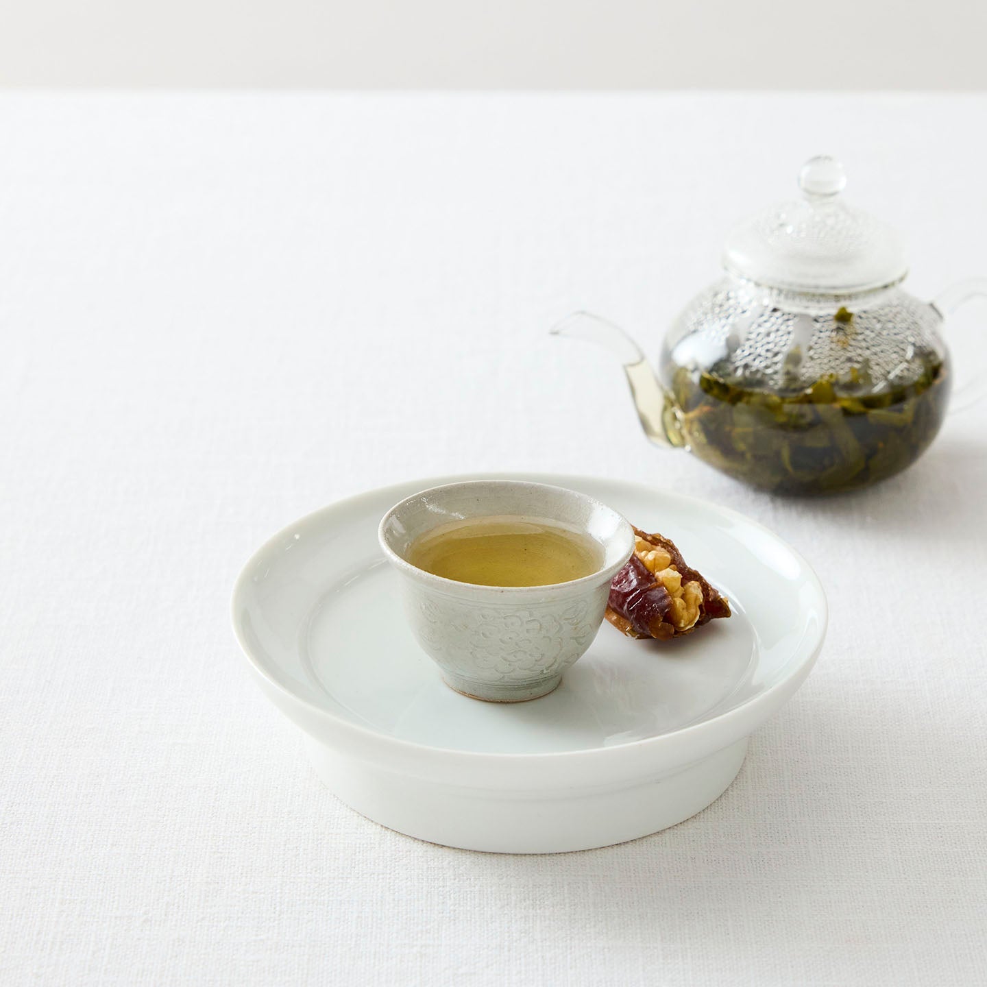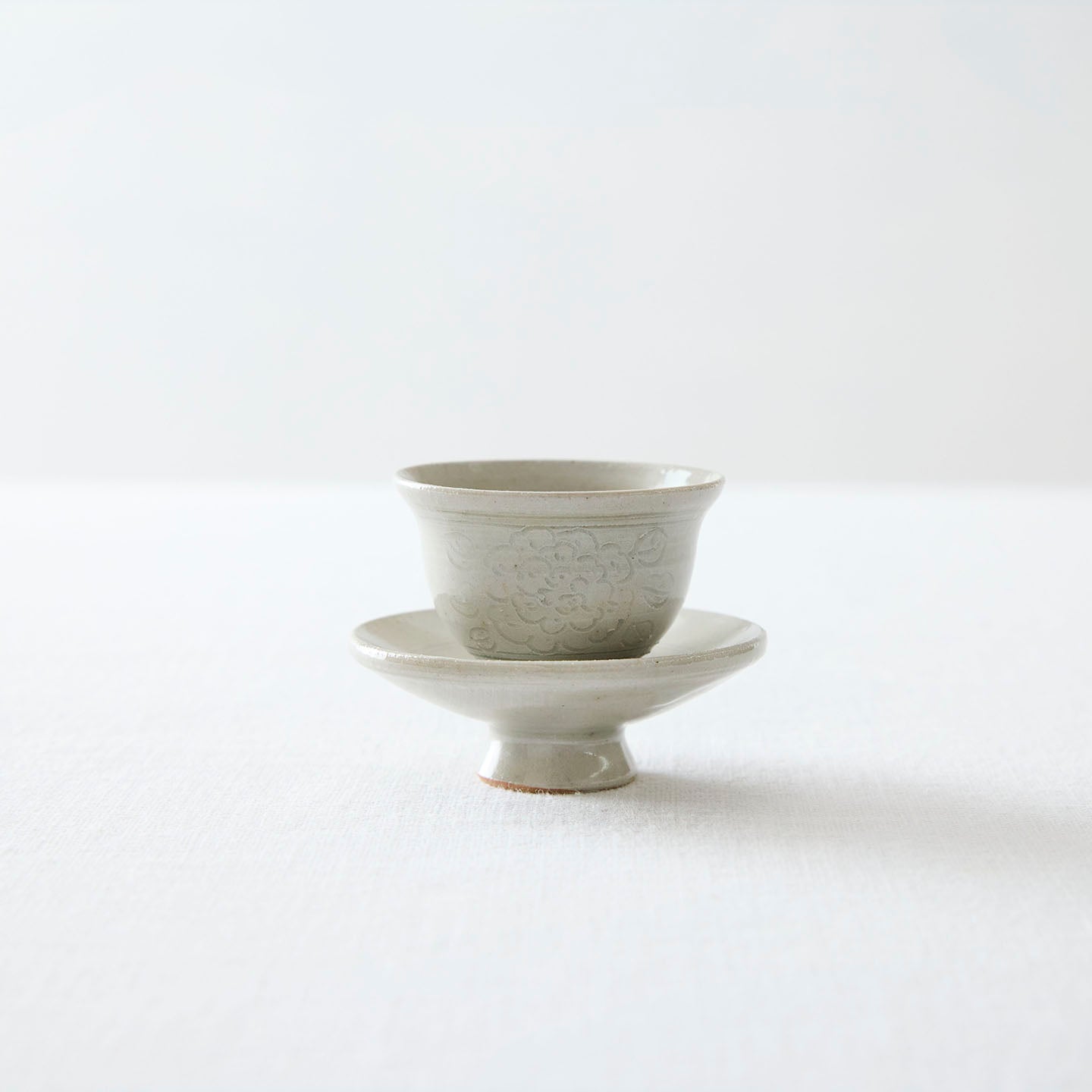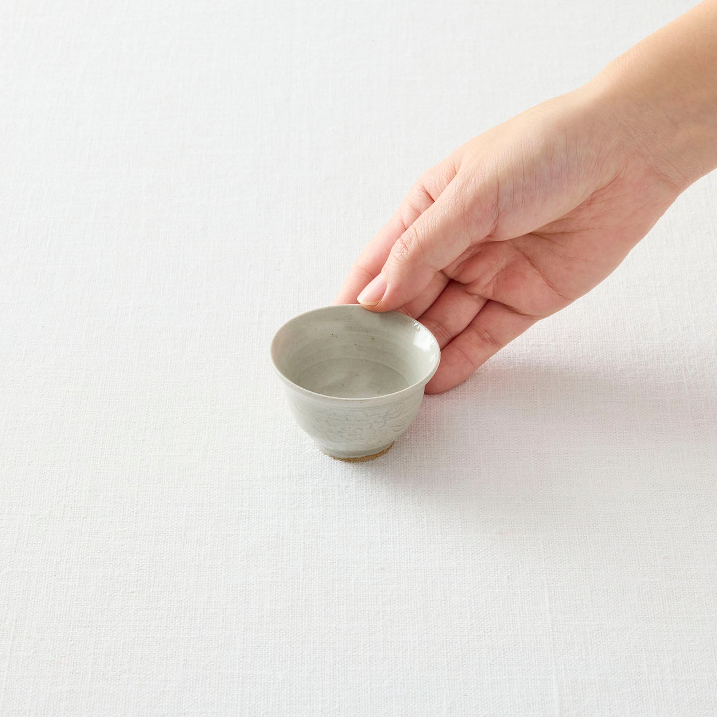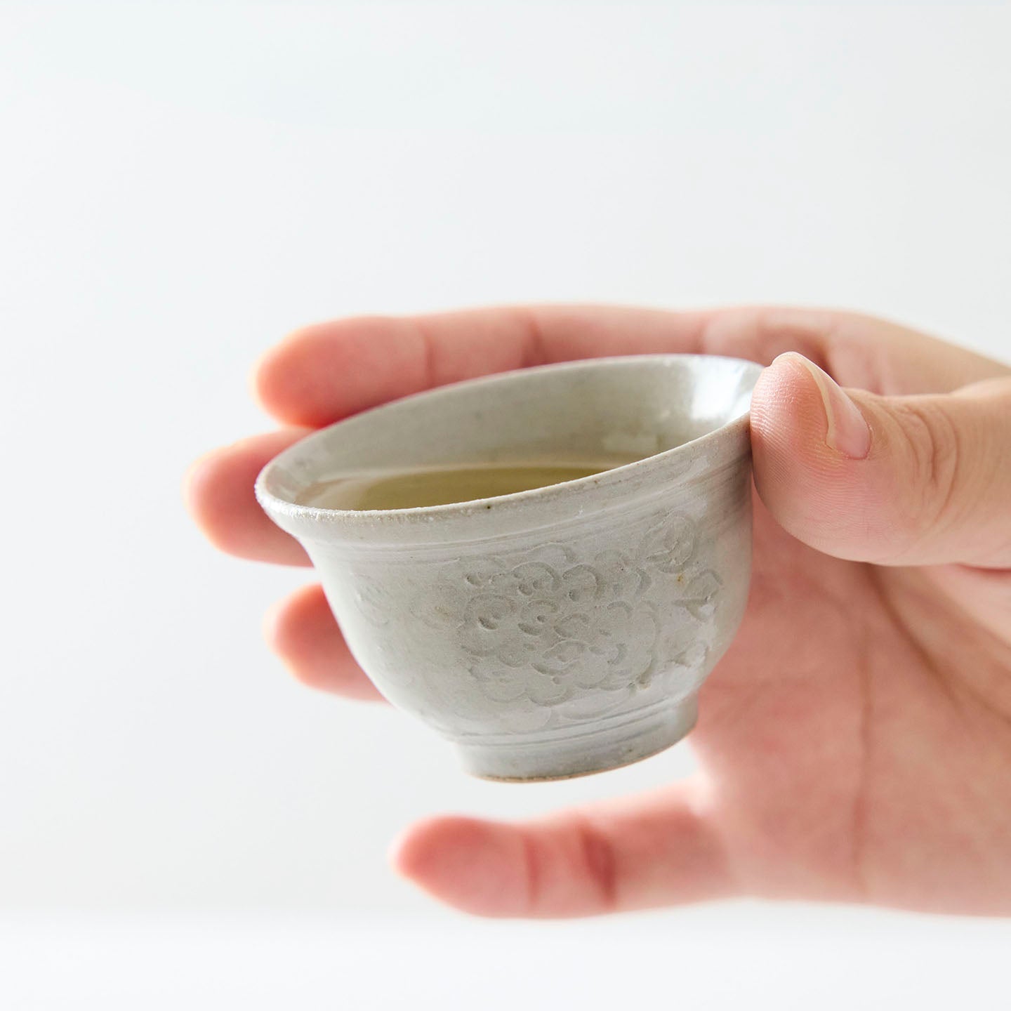 底に牡丹唐草が描かれた小さな「牡丹唐草茶杯」。つやのある白釉は、お茶の色がしっかり確認できるので、中国茶に限らずどんなお茶も楽しめます。