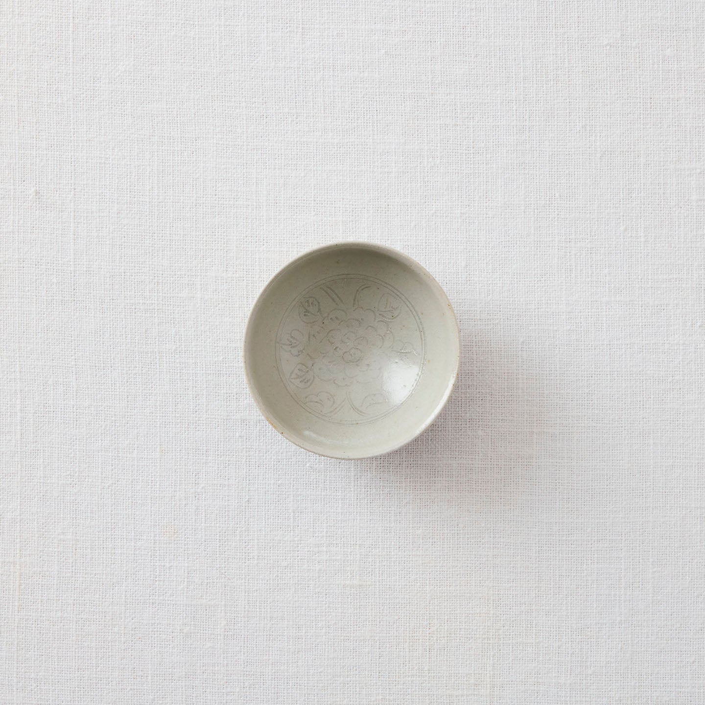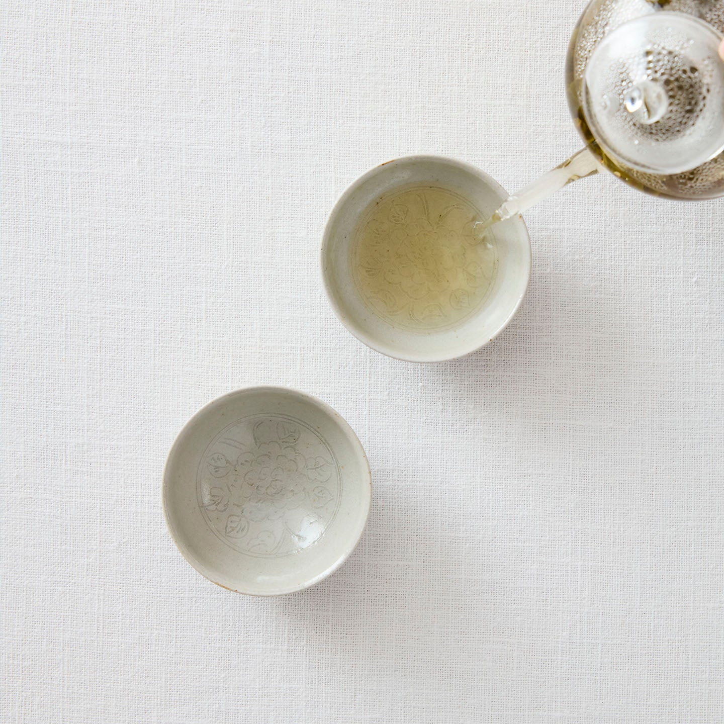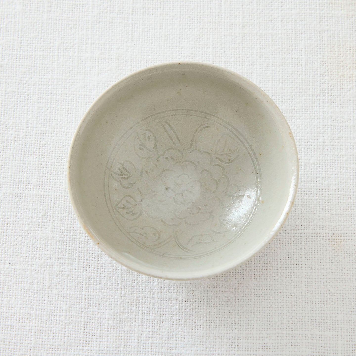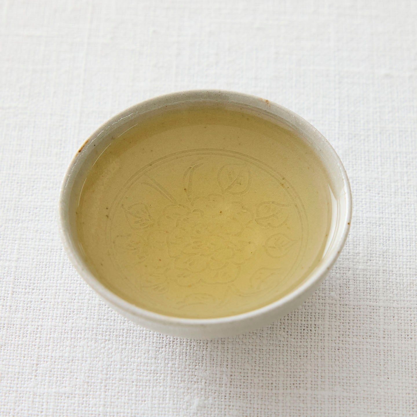 底に牡丹唐草が描かれた「 牡丹唐草白釉平茶杯」。つやのある白釉は、お茶の色がしっかり確認できるので、中国茶に限らずどんなお茶も楽しめます。
