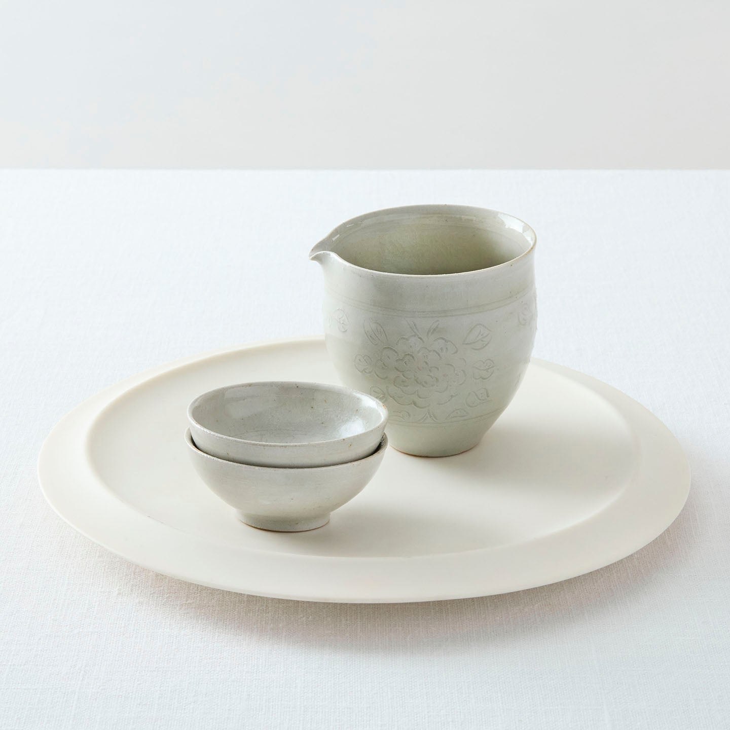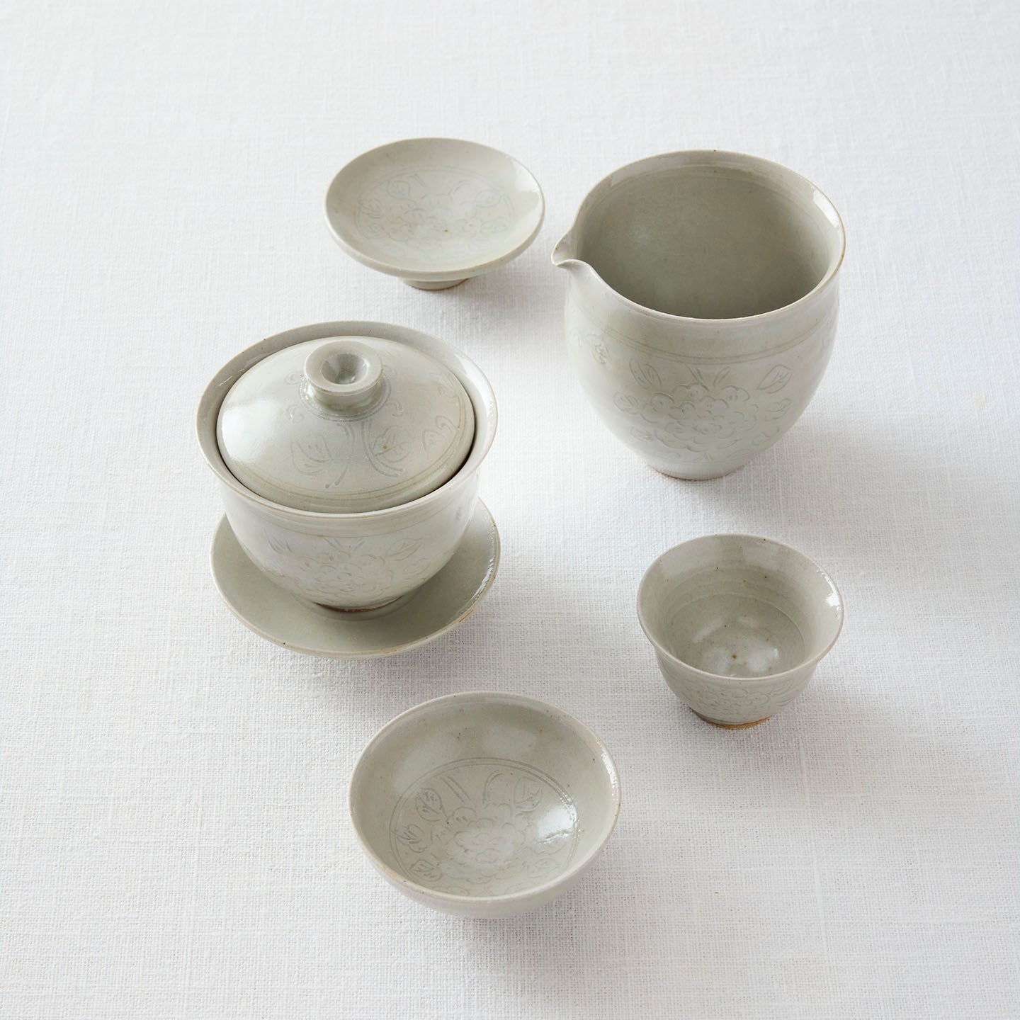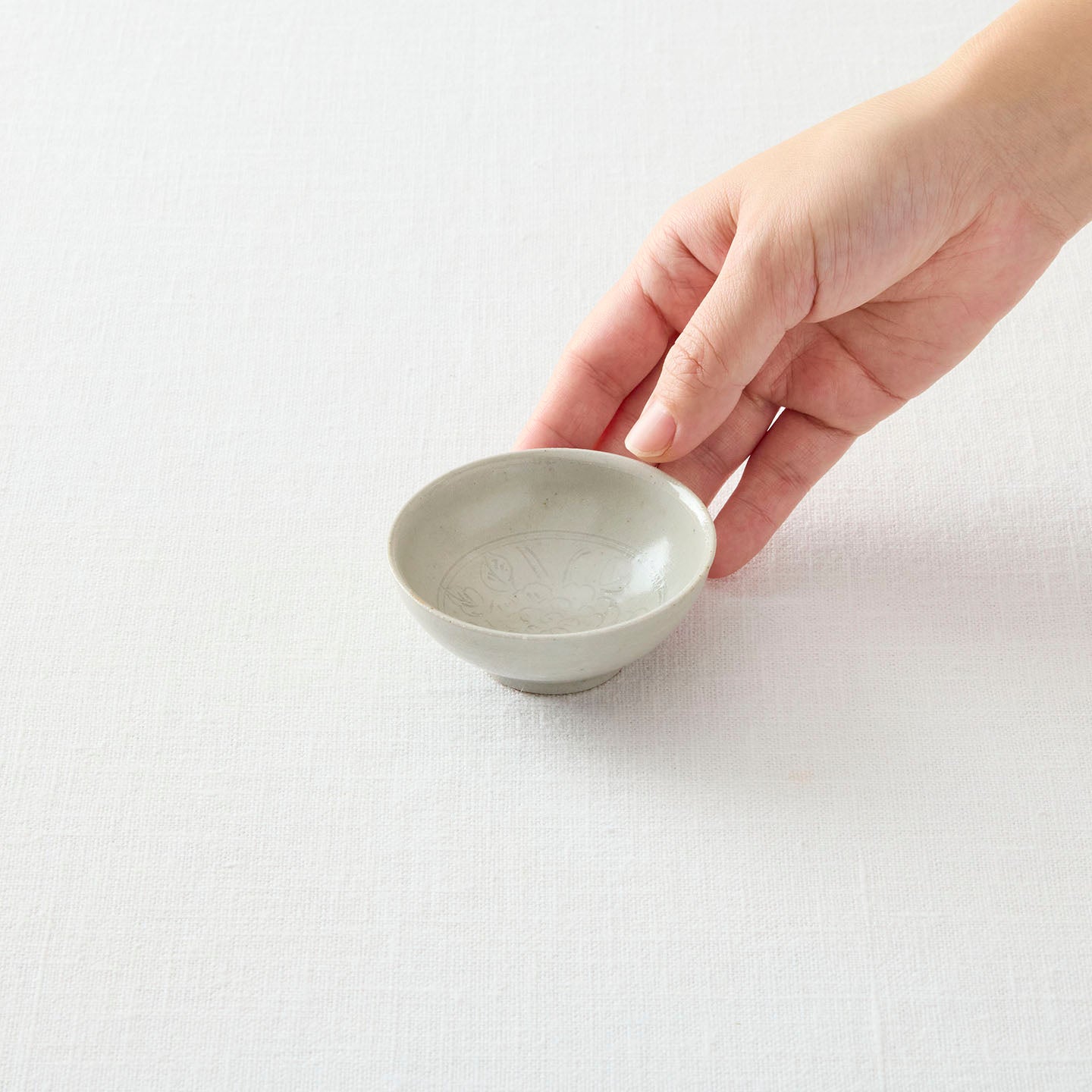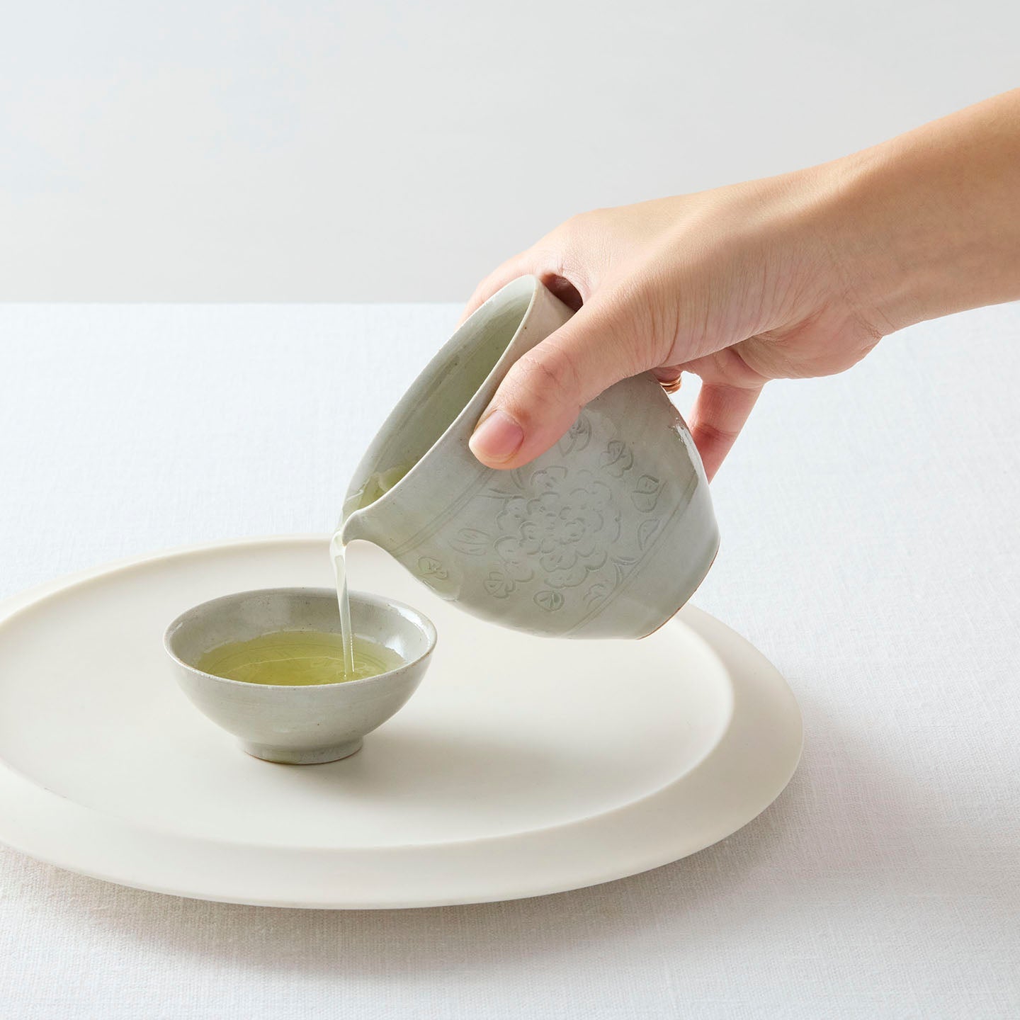 底に牡丹唐草が描かれた「 牡丹唐草白釉平茶杯」。つやのある白釉は、お茶の色がしっかり確認できるので、中国茶に限らずどんなお茶も楽しめます。