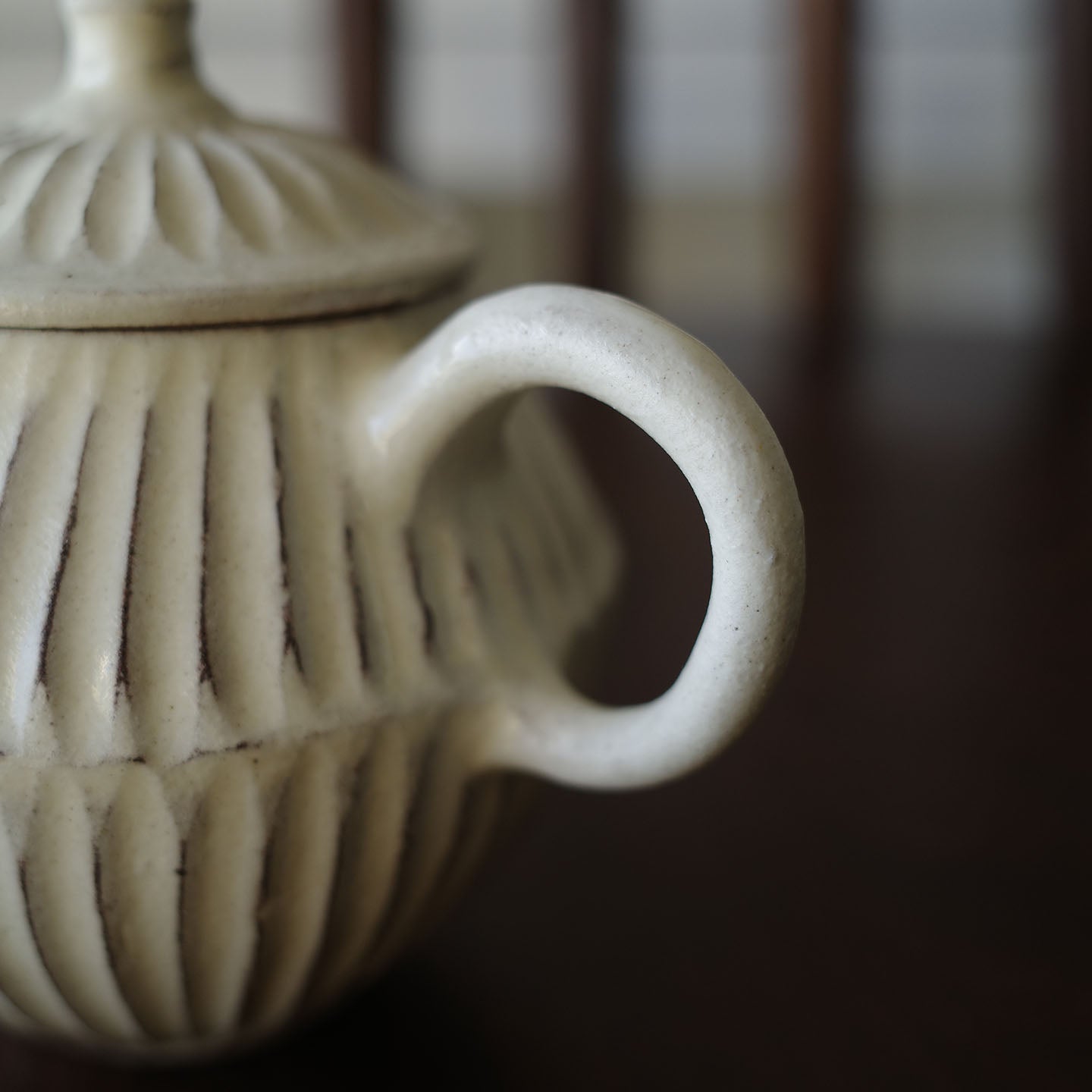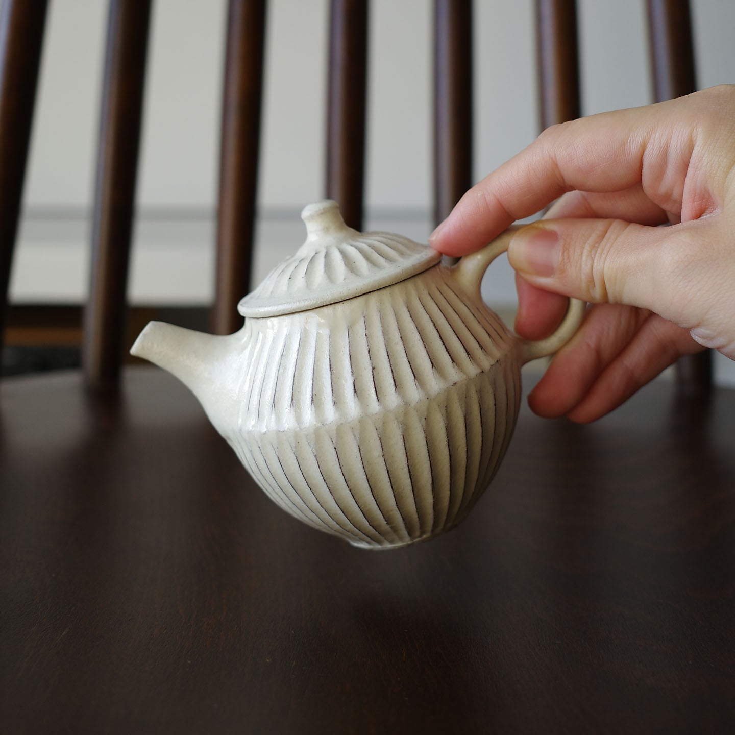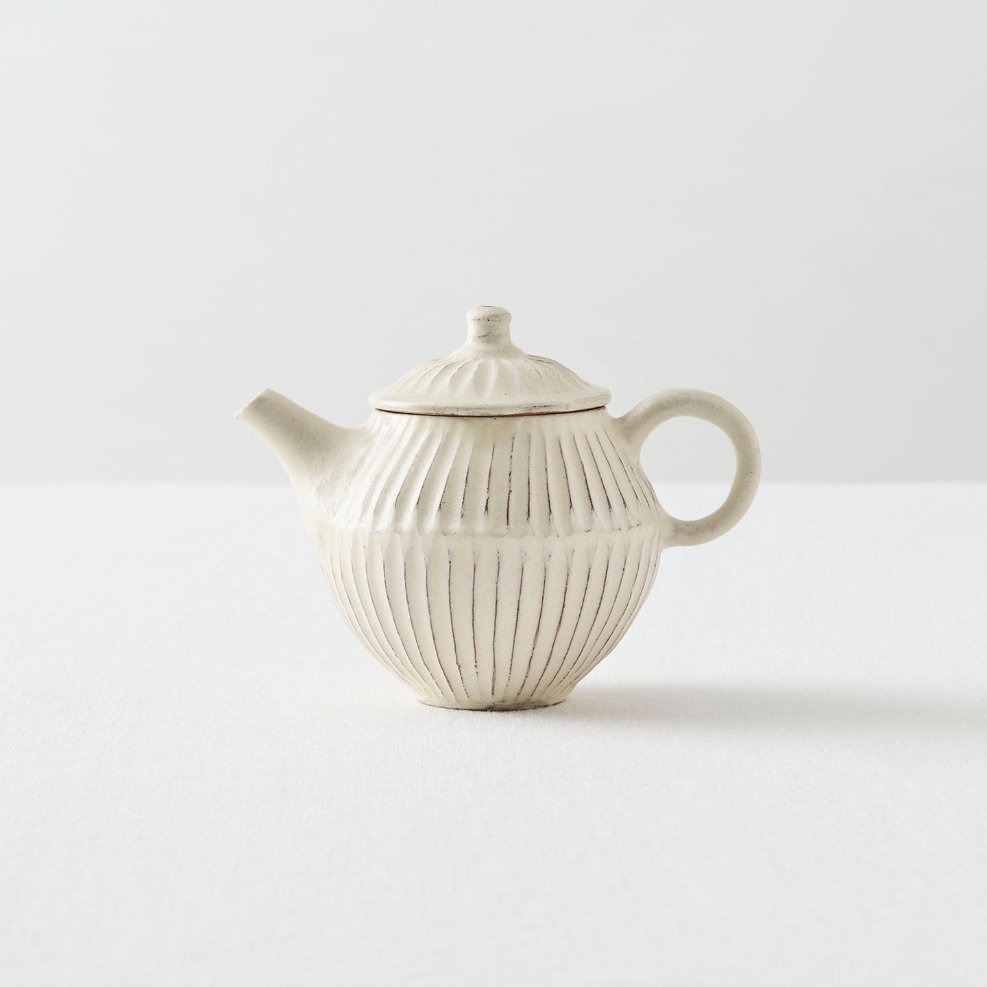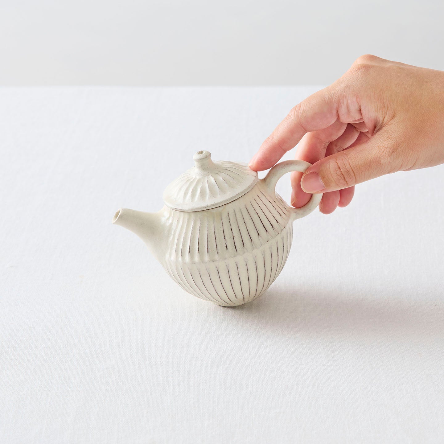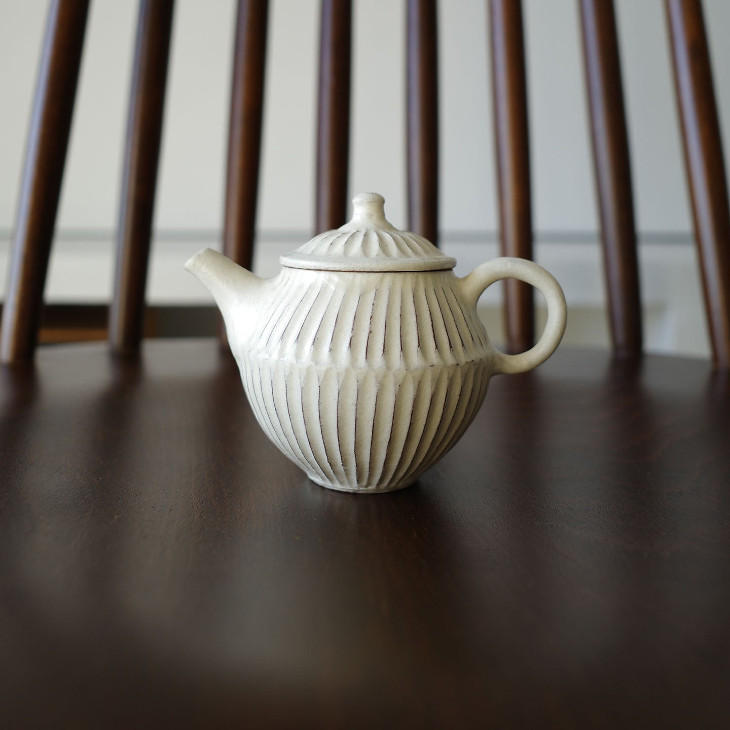 ころんと丸みのあるフォルムに、細かい鎬がリズミカルに刻まれた「縞茶壺」。小さな器ですが置くだけで空気が柔らかくなるような、静かな存在感があります。白釉はややクリームがかったやさしい色味で、黒い茶海や木のトレイと合わせると、より凛とした表情に。