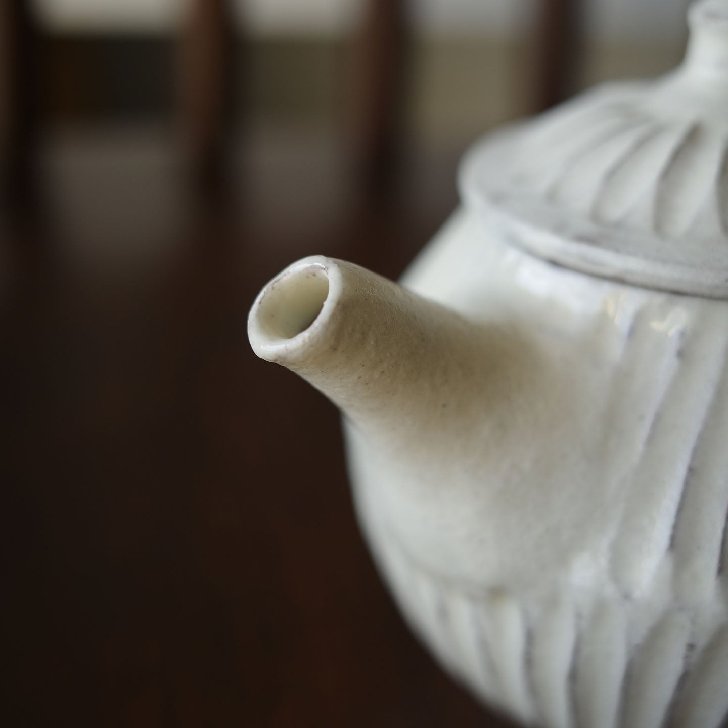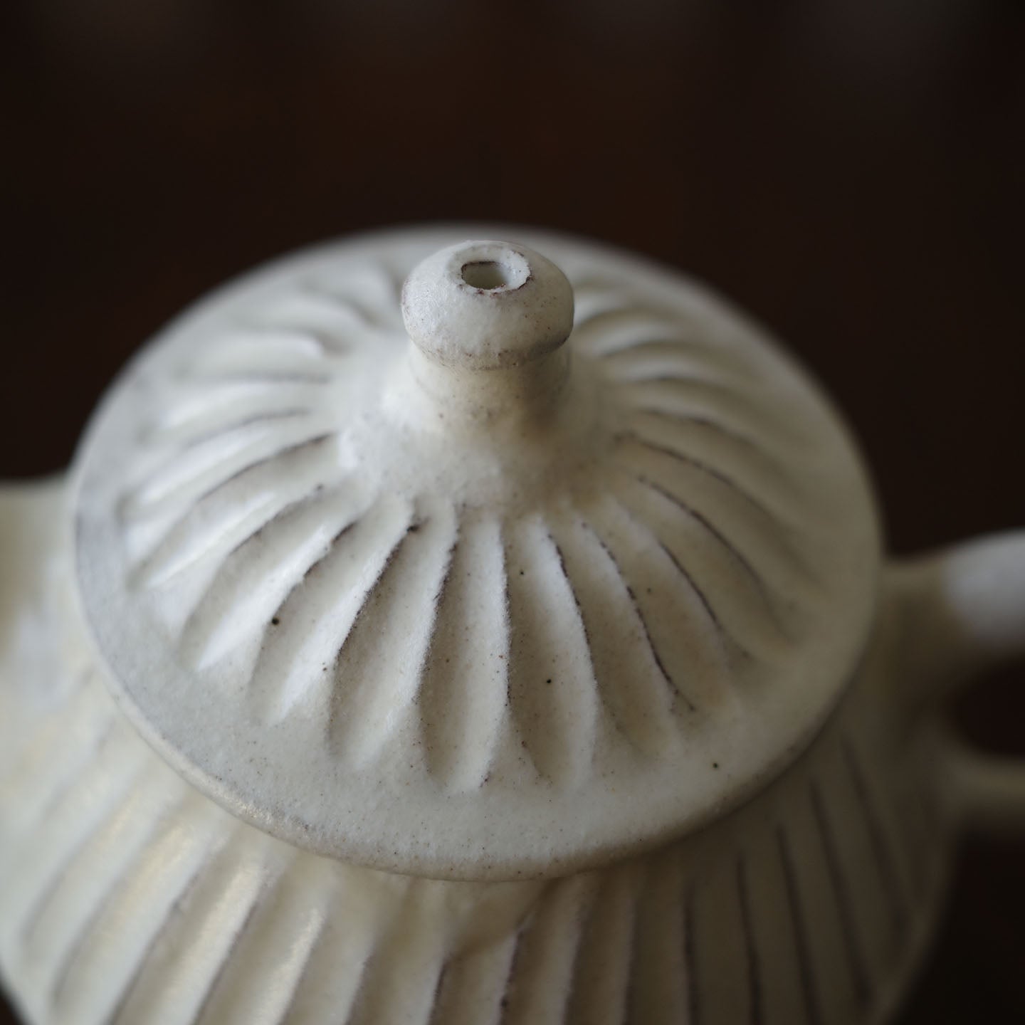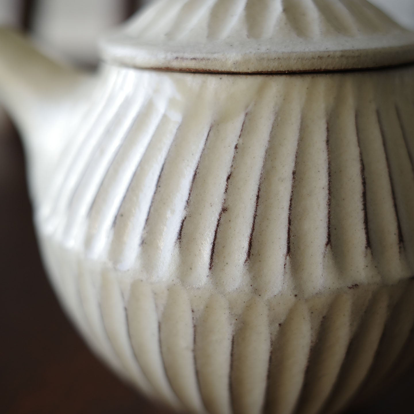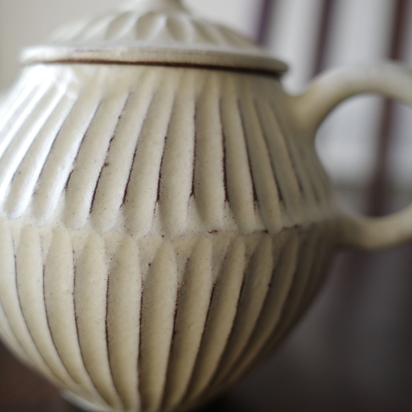 ころんと丸みのあるフォルムに、細かい鎬がリズミカルに刻まれた「縞茶壺」。小さな器ですが置くだけで空気が柔らかくなるような、静かな存在感があります。白釉はややクリームがかったやさしい色味で、黒い茶海や木のトレイと合わせると、より凛とした表情に。