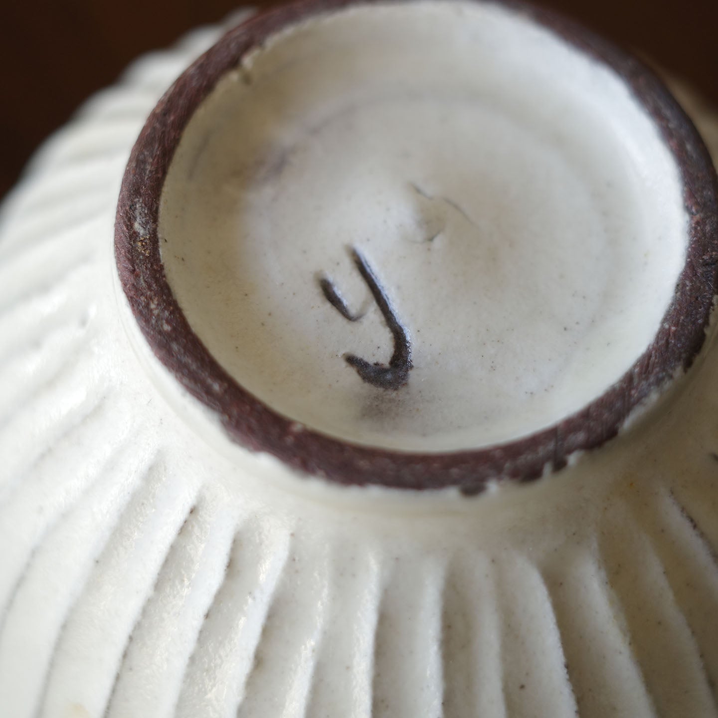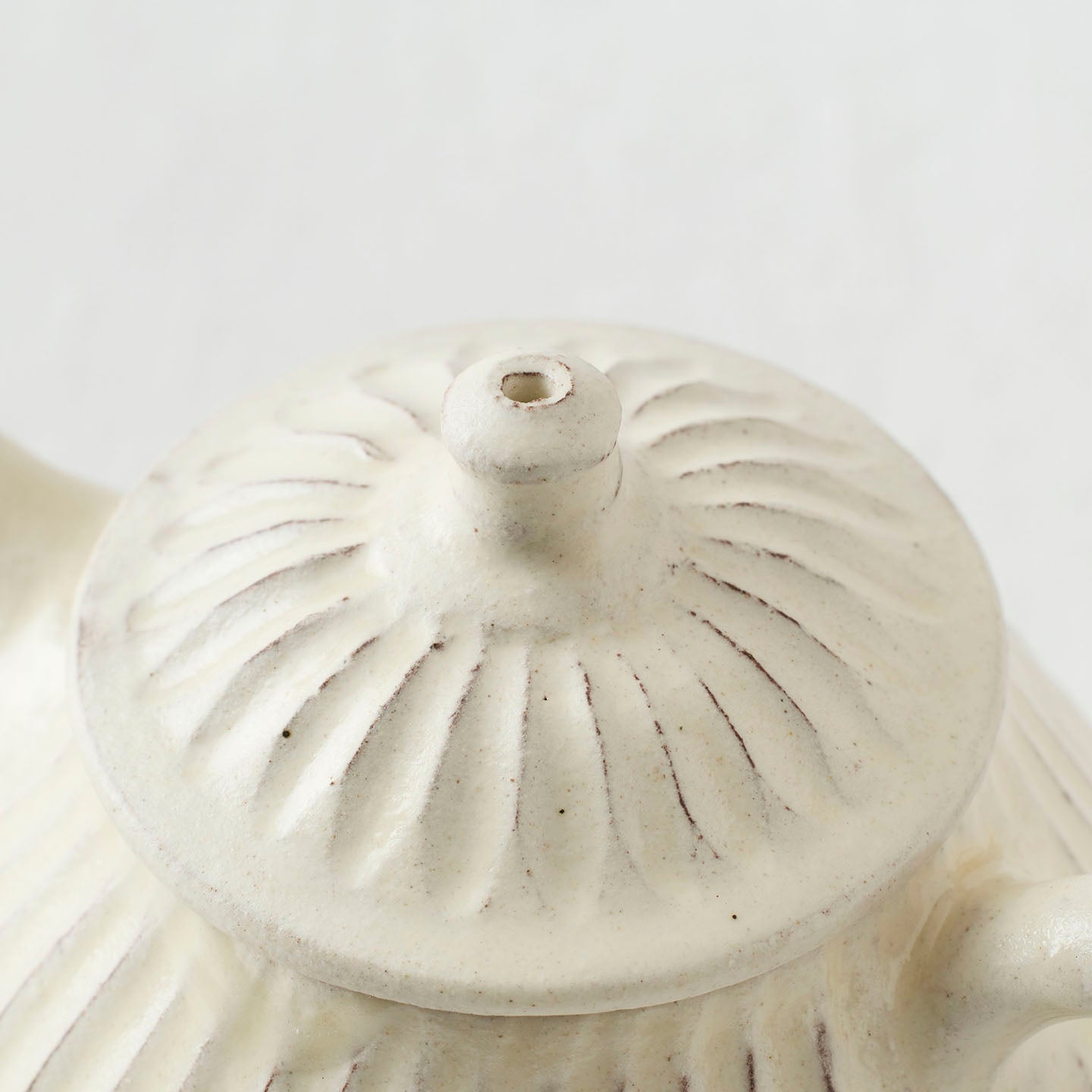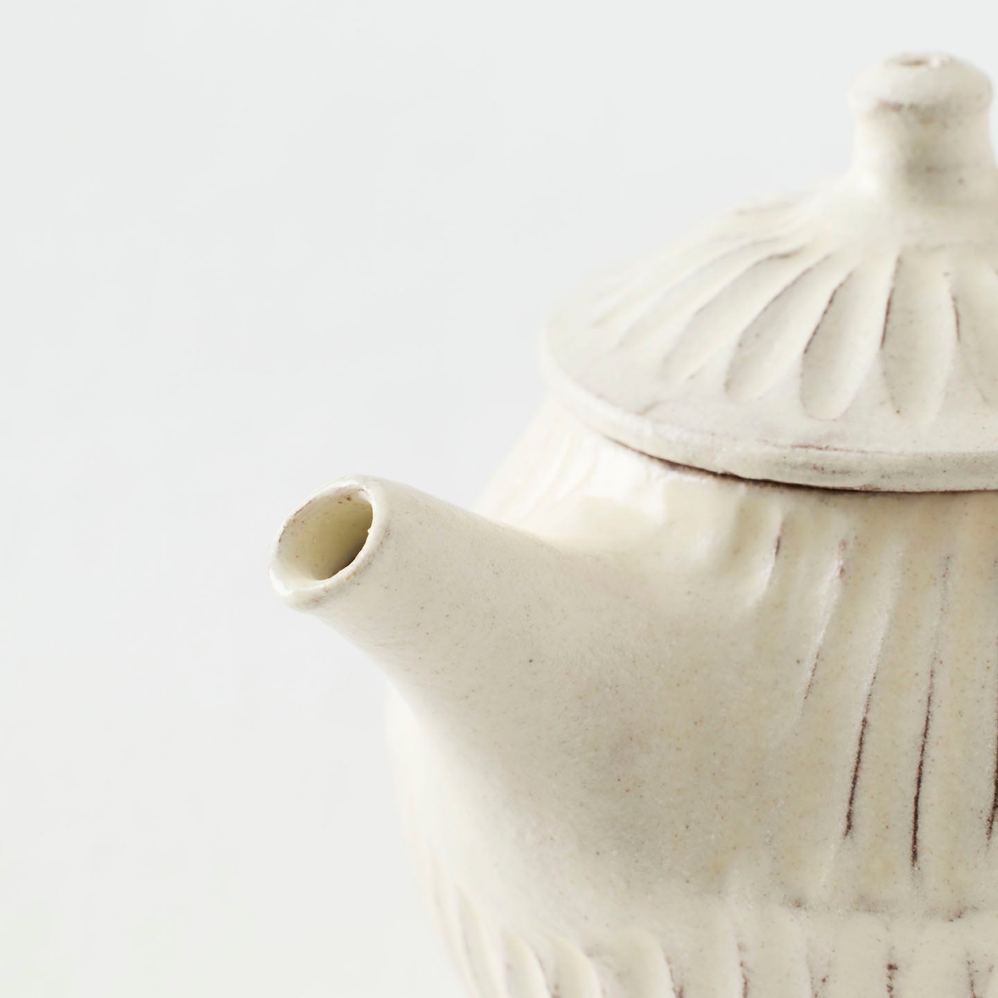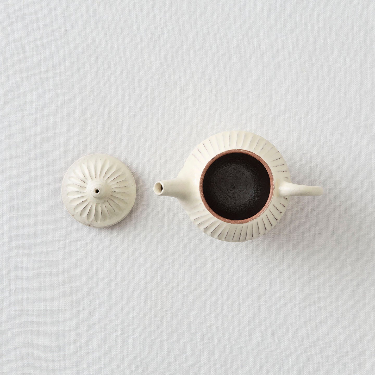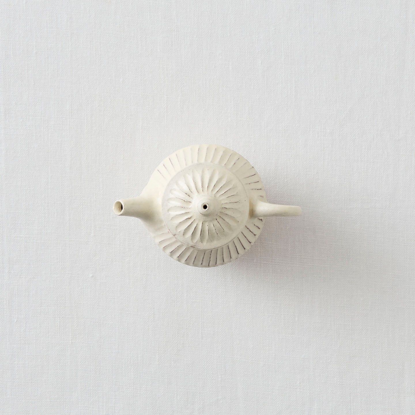 ころんと丸みのあるフォルムに、細かい鎬がリズミカルに刻まれた「縞茶壺」。小さな器ですが置くだけで空気が柔らかくなるような、静かな存在感があります。白釉はややクリームがかったやさしい色味で、黒い茶海や木のトレイと合わせると、より凛とした表情に。