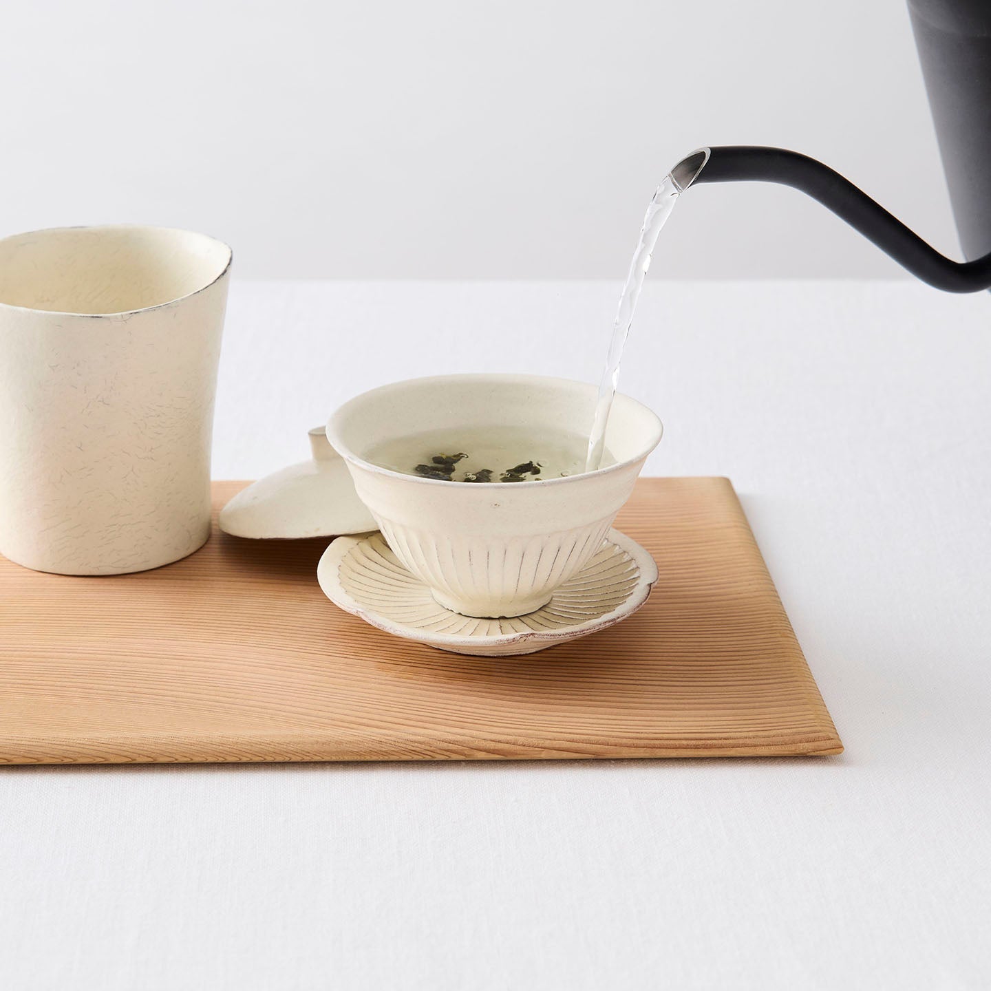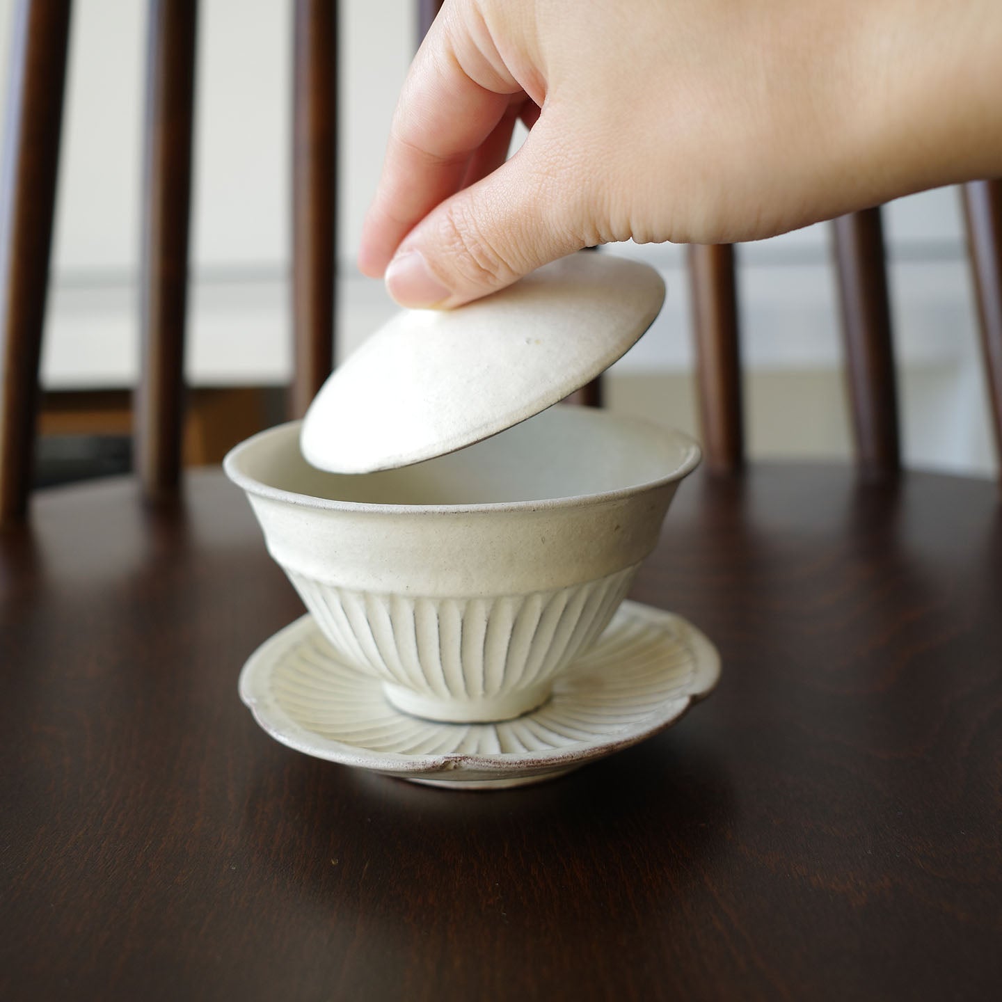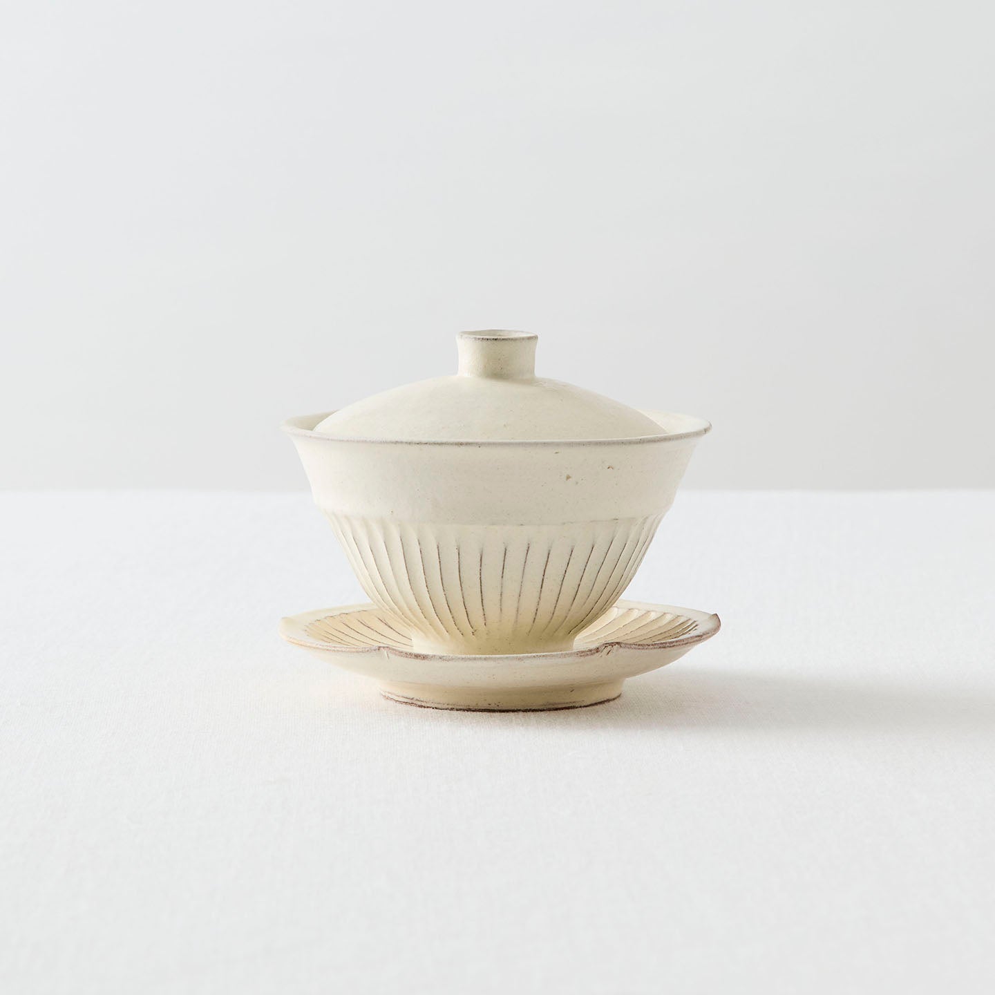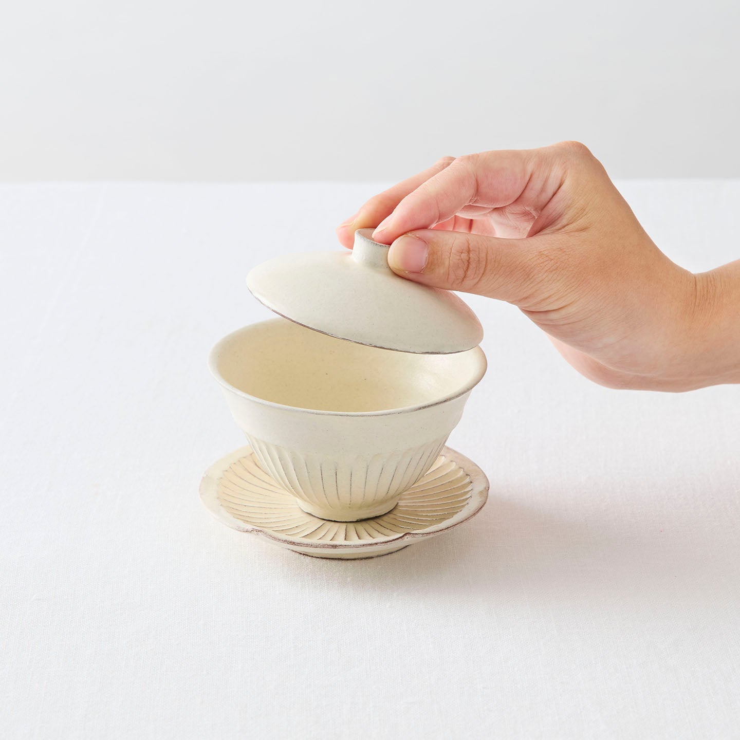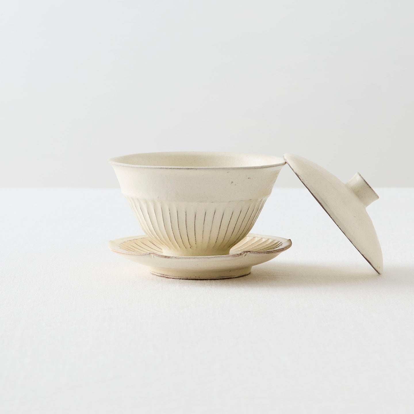 日々のお茶の時間を心地よくしてくれる、小さな相棒のような「縞蓋碗」。和でも洋でも、季節が変わっても馴染んでくれる後藤さんの白の器を、ぜひ暮らしの中で楽しんでみてください。
