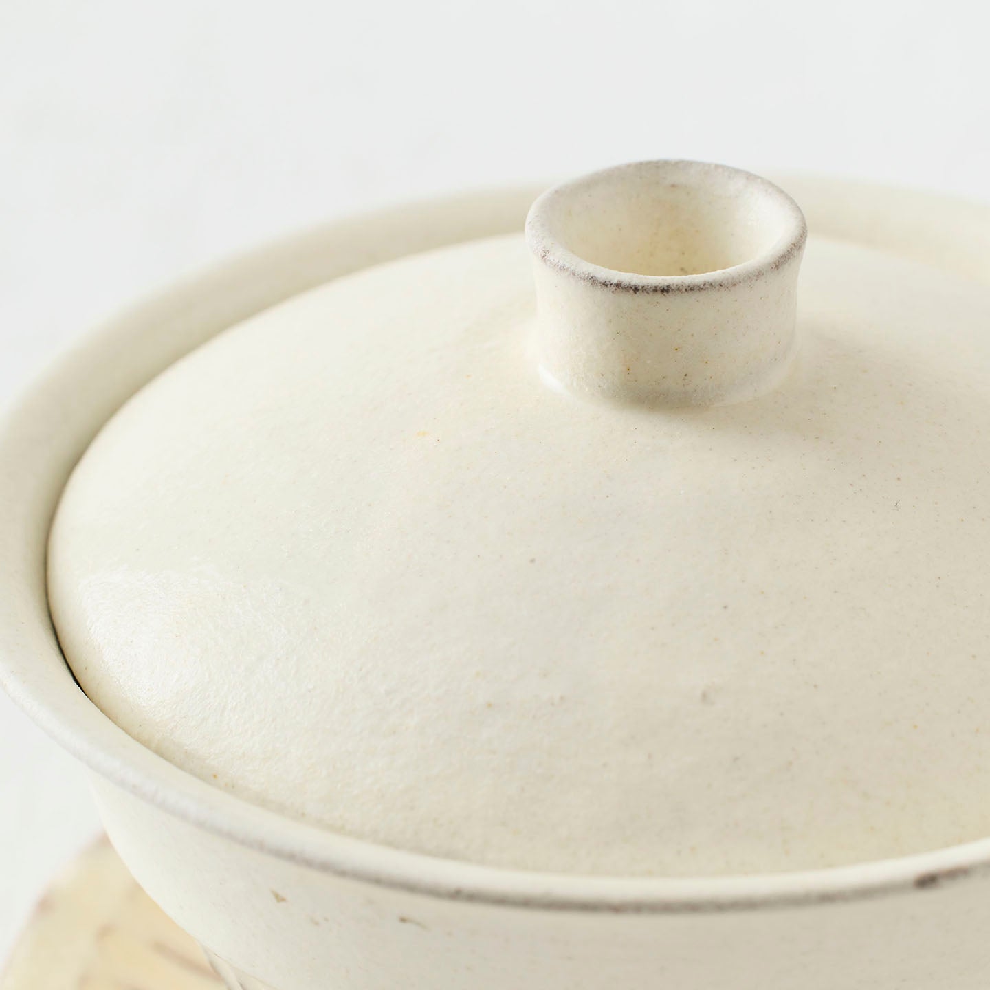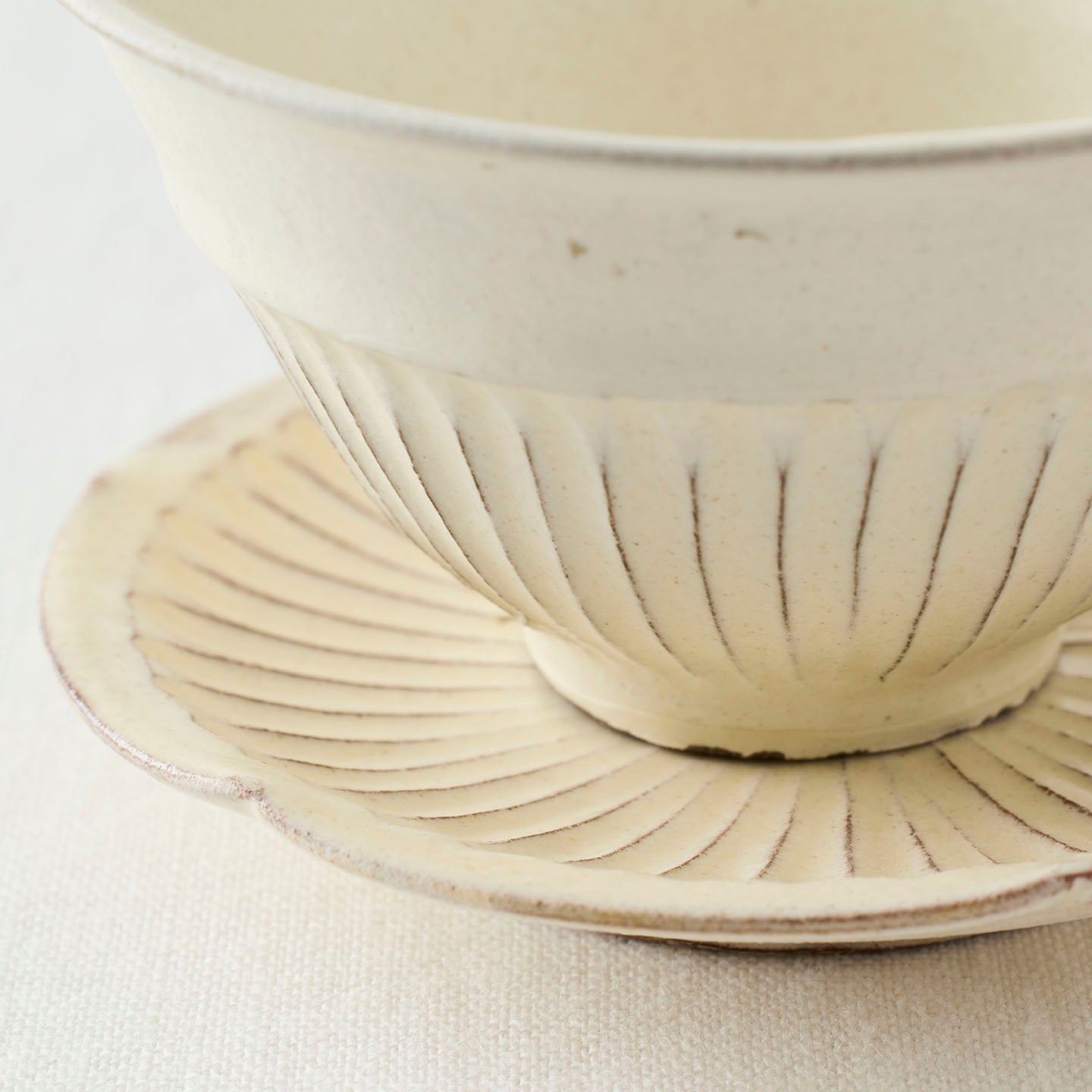 白い釉薬は柔らかい発色で、木のトレイや麻布のランチョンマットなど、素材を選ばず馴染みます。
